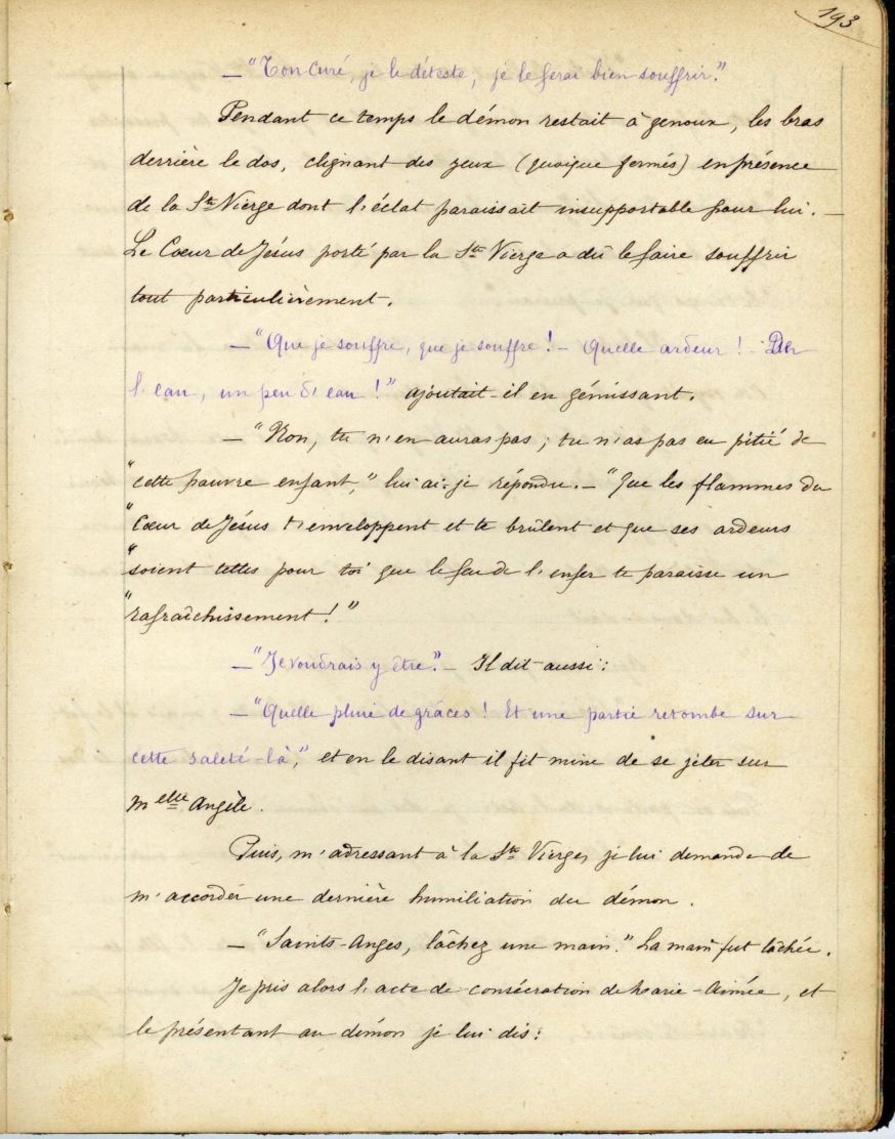 "-Saints-Anges, lâchez une main". La main fut lâchée. Je pris alors l’acte de consécration de Marie-Aimée, et le présentant au démon je lui dis:
