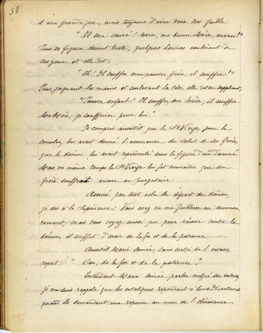 Je compris aussitôt que la Ste Vierge, pour la consoler, lui avait donné l’assurance du salut de son frère, que le démon lui avait représenté sous la figure d’un damné. Mais en même temps la Ste Vierge lui fit connaitre que son frère souffrait encore en Purgatoire. Assuré par tout cela du départ du démon, je dis à la Supérieure: Vous avez vu ma faiblesse au commencement, mais vous voyez aussi que pour réussir contre le démon il suffit d’avoir de la foi et de la patience. Aussitôt Marie-Aimée, sans sortir de l’extase, reprit: "Oui, de la foi et de la patience".
