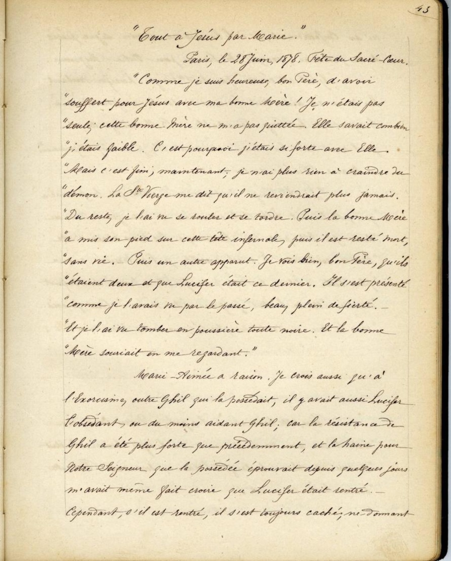 Marie-Aimée a raison. Je crois aussi qu’à l’Exorcisme, outre Ghil qui la possédait, il y avait aussi Lucifer l’obéissant, ou du moins aidant Ghil; car la résistance de Ghil a été plus forte que la possédée éprouvait depuis quelques jours m’avait même fait croire que Lucifer était rentré. Cependant, s’il est rentré, il s’est toujours caché; ne donnant