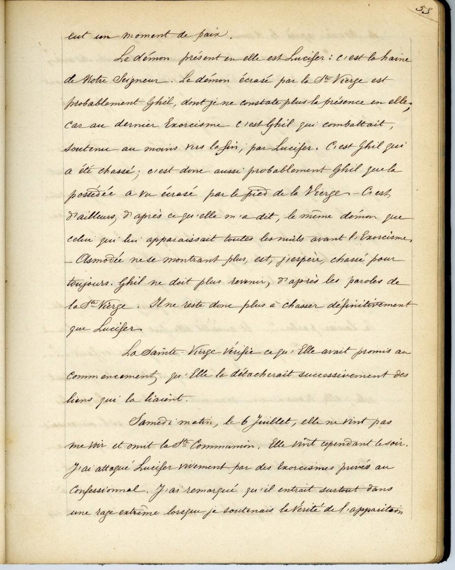 Le démon présent en elle est Lucifer: C’est la haine de Notre Seigneur. Le démon écrasé par la Ste Vierge est probablement Ghil, dont je ne constate plus la présence en elle; car au dernier Exorcisme c’est Ghil qui combattait, soutenu au moins vers la fin, par Lucifer. C’est Ghil qui a été chassé; c’est donc aussi probablement Ghil que la possédée a vu écrasé par le pied de la Vierge. C’est d’ailleurs, d’après ce qu’elle m’a dit, le même démon que celui qui lui apparaissait toutes les nuits avant l’Exorcisme. Asmodée ne se montrant plus, est, j’espère, chassé pour toujours. Ghil ne doit plus revenir, d’après les paroles de la Ste Vierge. Il ne reste donc plus à chasser définitivement que Lucifer.