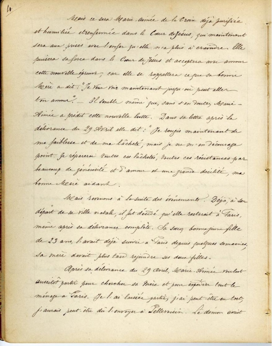 Après sa délivrance du 29 avril, Marie-Aimée voulut aussitôt partir pour chercher sa mère et pour expédier tout le ménage a Paris. Je l’ai laissée partir, j’ai peut-être en tort, j’aurais peut-être dû l’envoyer à Pellevoisin. Le démon avait