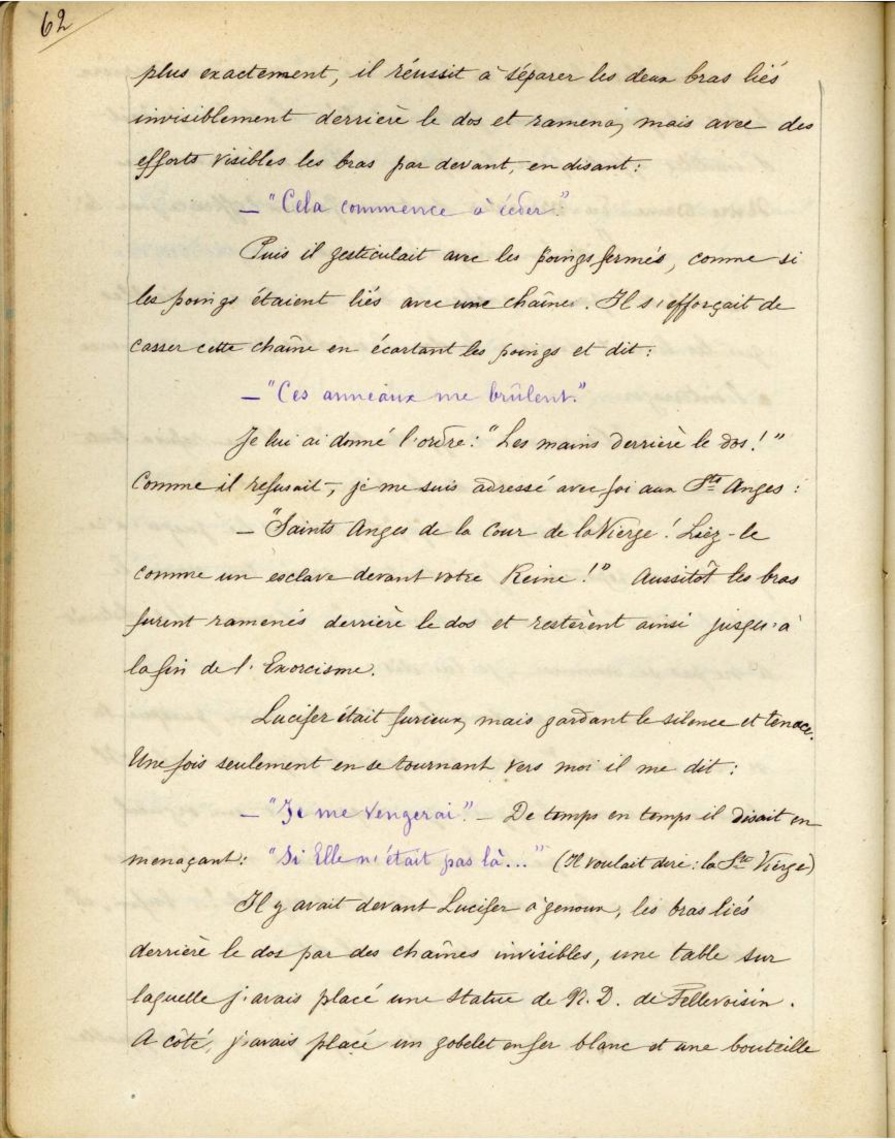 -"Saints Anges de la Cour de la Vierge! Liez-le comme un esclave devant votre Reine!". Aussitôt les bras furent ramenés derrière le dos et restèrent ainsi jusqu’à la fin de l’Exorcisme.