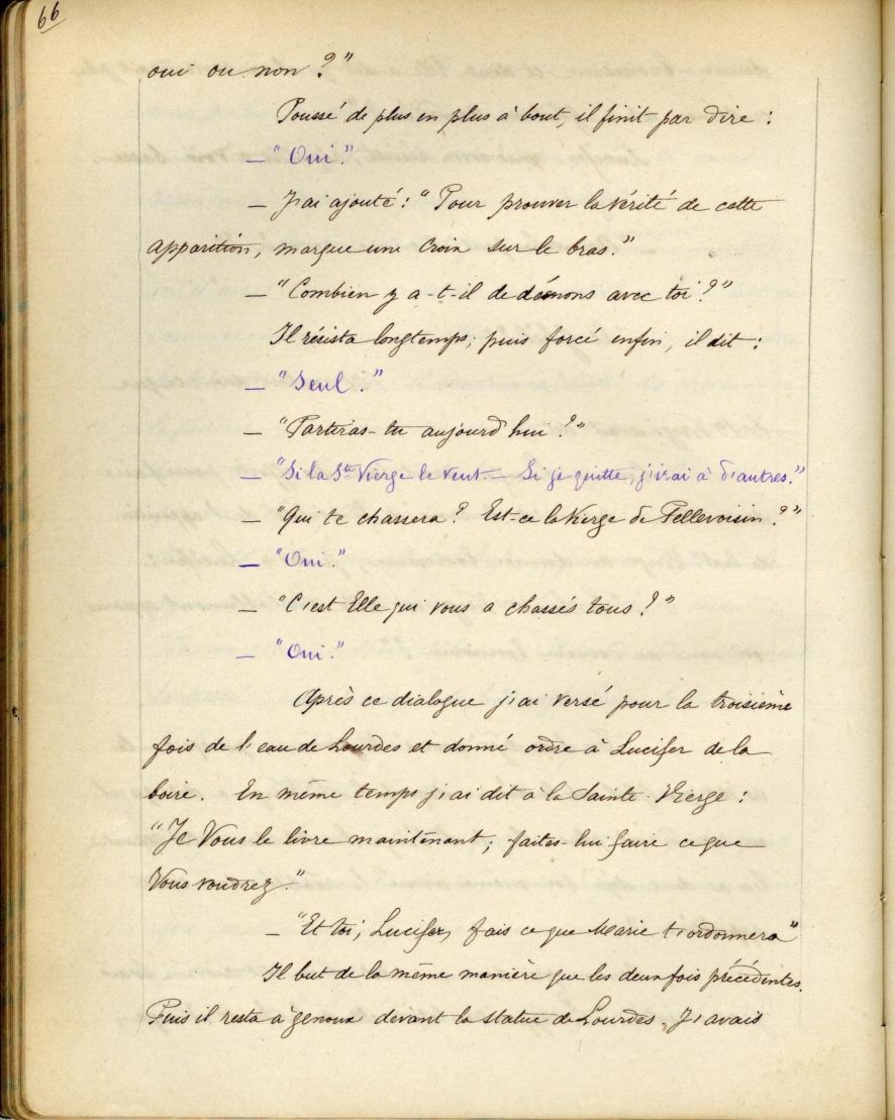 Après ce dialogue j’ai versé pour la troisième fois de l’eau de Lourdes et donné ordre à Lucifer de la boire. En même temps j’ai dit à la Sainte Vierge: "Je vous le livre maintenant; faites lui faire ce que Vous voudrez".