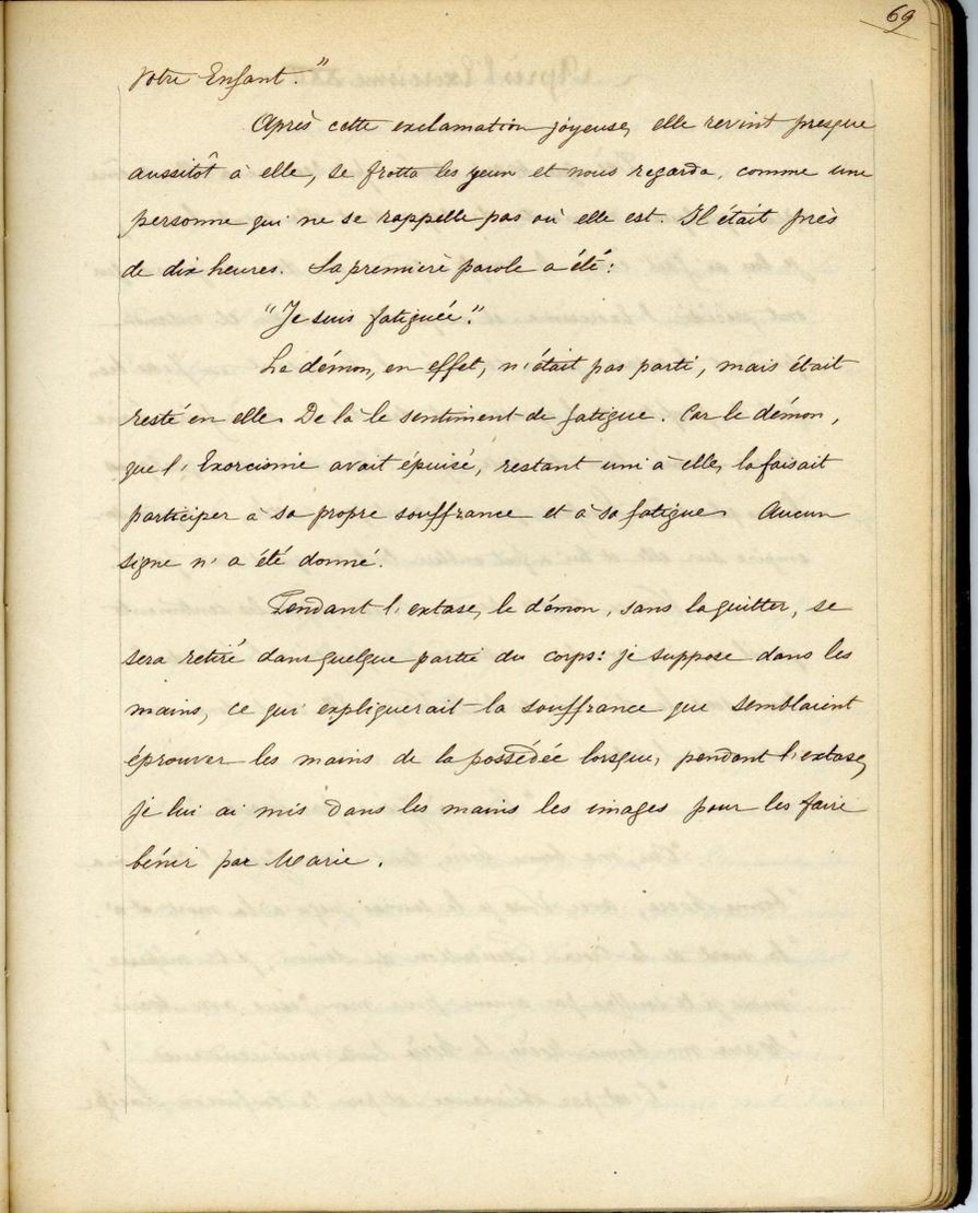 Pendant l’extase, le démon, sans la quitter, se sera retiré dans quelque partie du corps: je suppose dans les mains, ce qui expliquerait la souffrance que semblaient éprouver les mains de la possédée lorsque, pendant l’extase je lui ai mis dans les mains les images pour les faire bénir par Marie.