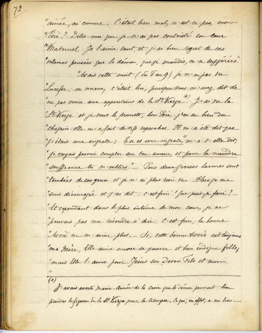 (1) J’avais averti Marie-Aimée de la croix que le démon pourrait bien prendre la figure de la Ste Vierge pour la tromper. Ce qui, en effet, a eu lieu.