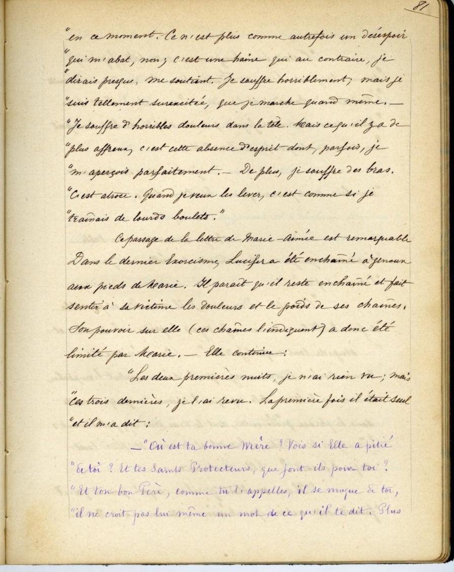 Ce passage de la lettre de Marie-Aimée est remarquable. Dans le dernière Exorcisme, Lucifer a été enchaîné à genoux aux pieds de Marie. Il paraît qu’il reste enchaîné et fait sentir à sa victime les douleurs et le poids de ses chaînes. Son pouvoir sur elle (ces chaînes l’indiquent) a donc été limité par Marie. Elle continue:
