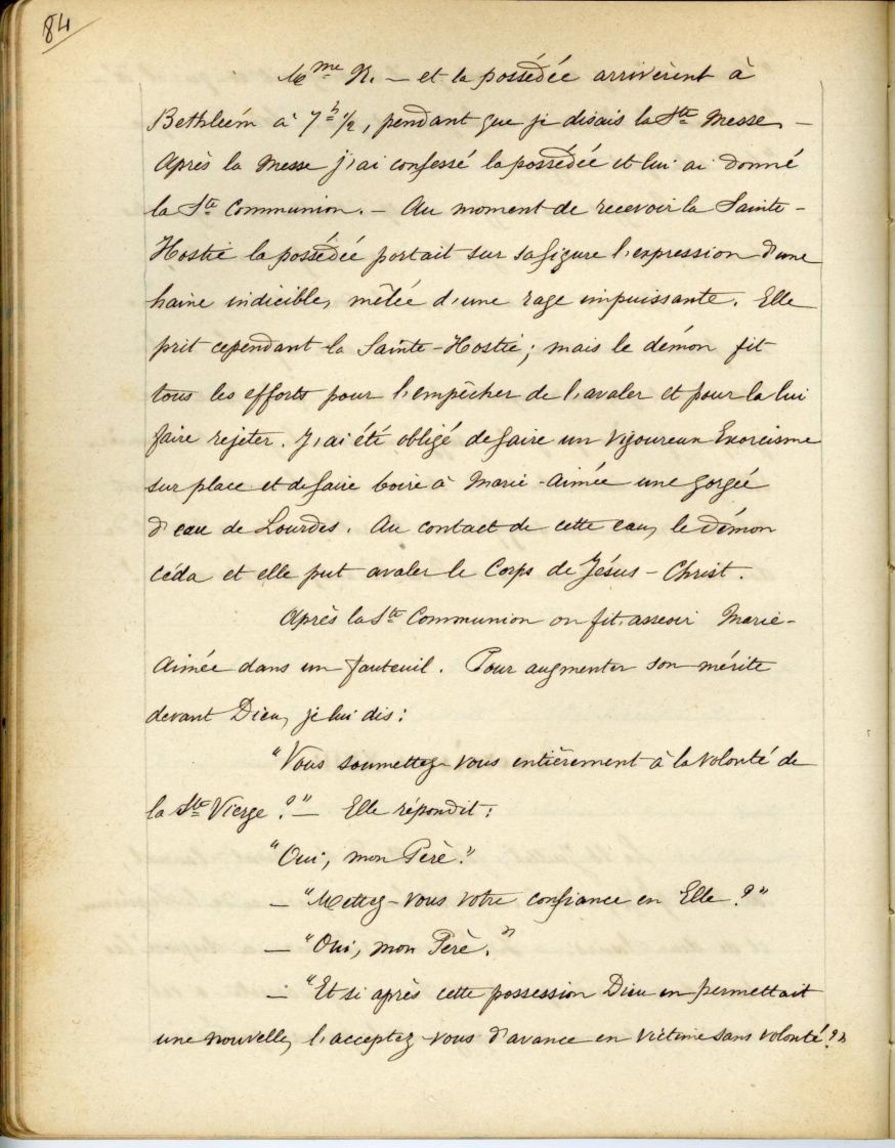 Mme N.… et la possédée arrivèrent à Bethléem à 7h ½, pendant que je disais la Ste Messe. Après la Messe j’ai confessé la possédée et lui ai donné la Ste Communion. Au moment de recevoir la Sainte-Hostie la possédée portait sur sa figure l’expression d’une haine indicible, mêlée d’une rage impuissante. Elle prit cependant la Sainte Hostie; mais le démon fit tous les efforts pour l’empêcheur de l’avaler et pour la lui faire rejeter. J’ai été obligé de faire un vigoureux Exorcisme sur place et de faire boire à Marie-Aimée une gorgée d’eau de Lourdes. Au contact de cette eau, le démon céda et elle put avaler le corps de Jésus-Christ.