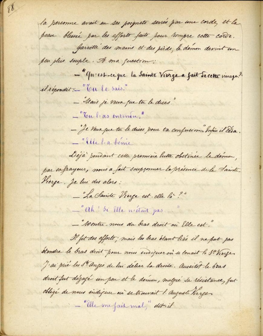 Il fit des efforts; mais les bras étant liés il ne put pas étendre le bras droit pour nous indiquer où se tenait la Ste Vierge. J’ai prié les Sts Anges de lui délier la droite. Aussitôt le bras droit fut dégagé un peu et le démon, malgré sa résistance, fut obligé de nous indiquer l’Auguste Vierge.