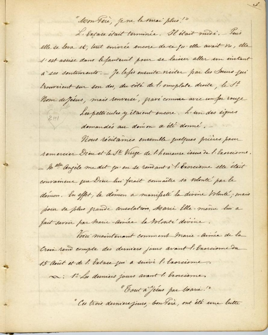 Nous récitâmes ensemble quelques prières pour remercier Dieu et la Ste Vierge de l’heureuse issue de l’Exorcisme. Melle Angèle me dit qu’en se rendent à l’Exorcisme elle était convaincue que Dieu lui ferait connaître sa volonté par le démon. En effet, le démon a manifesté la divine Volonté; mais pour sa plus grande consolation, Marie Elle-même lui a fait savoir par Marie-Aimée la Volonté divine.