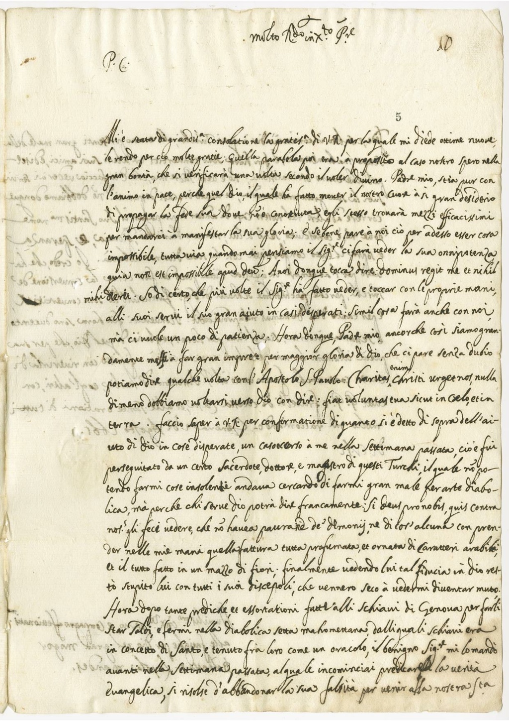 Mi è stata di grandissima consolatione la gratissima di V. R. per la quale mi diede ottime nuove, le rendo per ciò molte gratie. Quella parabola poi era a proposito al caso nostro spero nella gran bontà, che si verificarà una volta secondo il voler divino. Padre mio, stia pur con l’animo in pace, perché quel Dio, il quale ha fatto mover il nostro cuore a sì gran desiderio di propagar la fede sua dove non è conosciuta, Egli stesso trovarà mezzi eficacissimi per mandarci a manifestar la sua gloria; e se bene pare a noi cio per adesso esser cosa impossibile, tuttavia quando mai pensiamo il Signore ci farà veder la sua omnnipotenza quia non est impossibile apud Deum. A noi donque tocca dire: Dominus regit me et nihil mihi dierit. So di certo, che più volte il Signore ha fatto veder, e toccar con le proprie mani, alli suoi servi il suo gran aiuto in casi disperati. Simil cosa farà anche con noi, ma ci vuole un poco di patienza. Hora donque, Padre mio, ancorché così siamo grandemente mossi a far gran imprese per maggior gloria di Dio, che ci pare senza dubio potiamo dire qualche volta con l’apostolo S. Paolo: Charistas enim Christi urget nos, nulla di meno dobbiamo voltarsi verso Dio con dire: fiat voluntas tua sicut in caelo, et in terra. Faccio saper a V. R. per confirmatione di quanto si è detto di sopra dell’aiuto di Dio in cose disperate, un caso accorso a me nella settimana passata, cioè dui perseguitato da un certo sacerdote, dottore, e magestro di questi turchi, il quale non potendo farmi cose insolenti andava cercando di farmi gran male per arte diabolica, ma perché chi serve Dio potrà dire francamente: Si Deus pro nobis quis contra nos gli feci vedere, che non haveva paura né de’demonii, né di cos’alcuna con prender nelle mie mani quella fattura tutta profumata, et ornata di caratteri arabici et il tutto fatto in un mazzo di fiori; finalmente vedendo lui tal fiducia in Dio restò stupito lui con tutti i suoi discepoli, che vennero seco a vedermi diventar muto. Hora dopo tante prediche, et essortationi fatte alli schiavi di Genova per farli star saldi e fermi nella diabolica setta mahomettana, dalli quali schiavi era in concetto di Santo, e tenuto fra loro come un oracolo, il benigno Signore mi lo mandò avanti nella settimana passata, al quale incomiciai predicare la verità evangelica, si risolse d’abbandonar la sua falsità ver venir alla nostra Santa