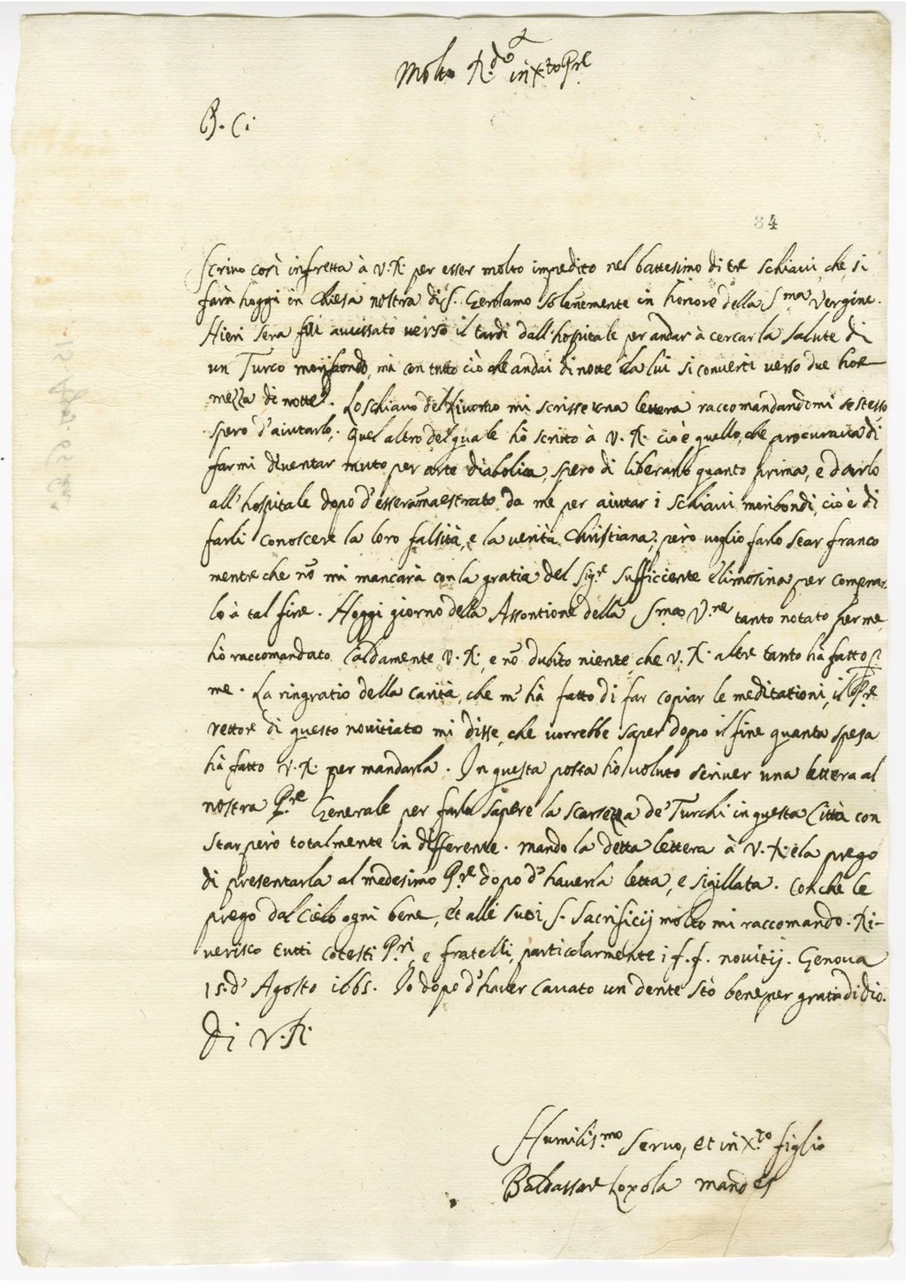Lo schiavo del Livorno mi scrisse una lettera raccimandandomi se stesso spero d’aiutarlo; quel altro del quale ha scritto a V. R. cioè quello che procurava di farmi diventar muto per arte diabolica, spero di liberarlo quanto prima, e darlo all’hospitale dopo d’esser ammaestrato da me per aiutar i schiavi moribondi, cio è di farli conoscere la loro falsità e la verità christiana, perì voglio farlo star franco mentre che non mi mancarà con la gratia del Signore sufficiente elimosina per comprarlo a tal fine.