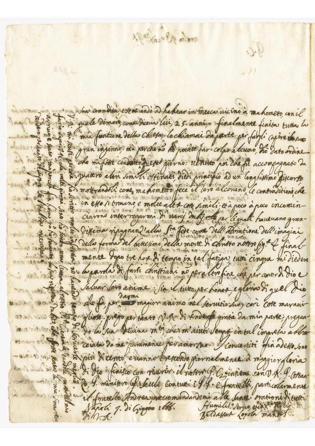 Finalmente dopo tre hore di tempo in tal fatiga, tutti cinque mi diedero la parola di farsi christiani non per altro fine che per amor di Dio e salvar loro anime. Sia il tutto per honore e gloria di quel Dio che fà per darmi magior animo nel servitio suo, così cose maravigliose, prego per tanto V. R. di rendergli gratie da mia parte; pregando la sua divina Maestà che m'aiuti sempre in tal impresa abbracciata da me puramente per amor suo. I convertiti fin adesso sono più di cento e vanno crescendo giornalmente à maggio gloria di Dio. Finisco con riverir il nostro P. Generale insieme con V. R., P. Costanzo, P. ministro, P. Sauli, con tutti i Padri e fratelli, particolarmente il fratello Andrea, raccomandandomi alle Sante orationi di tutti.