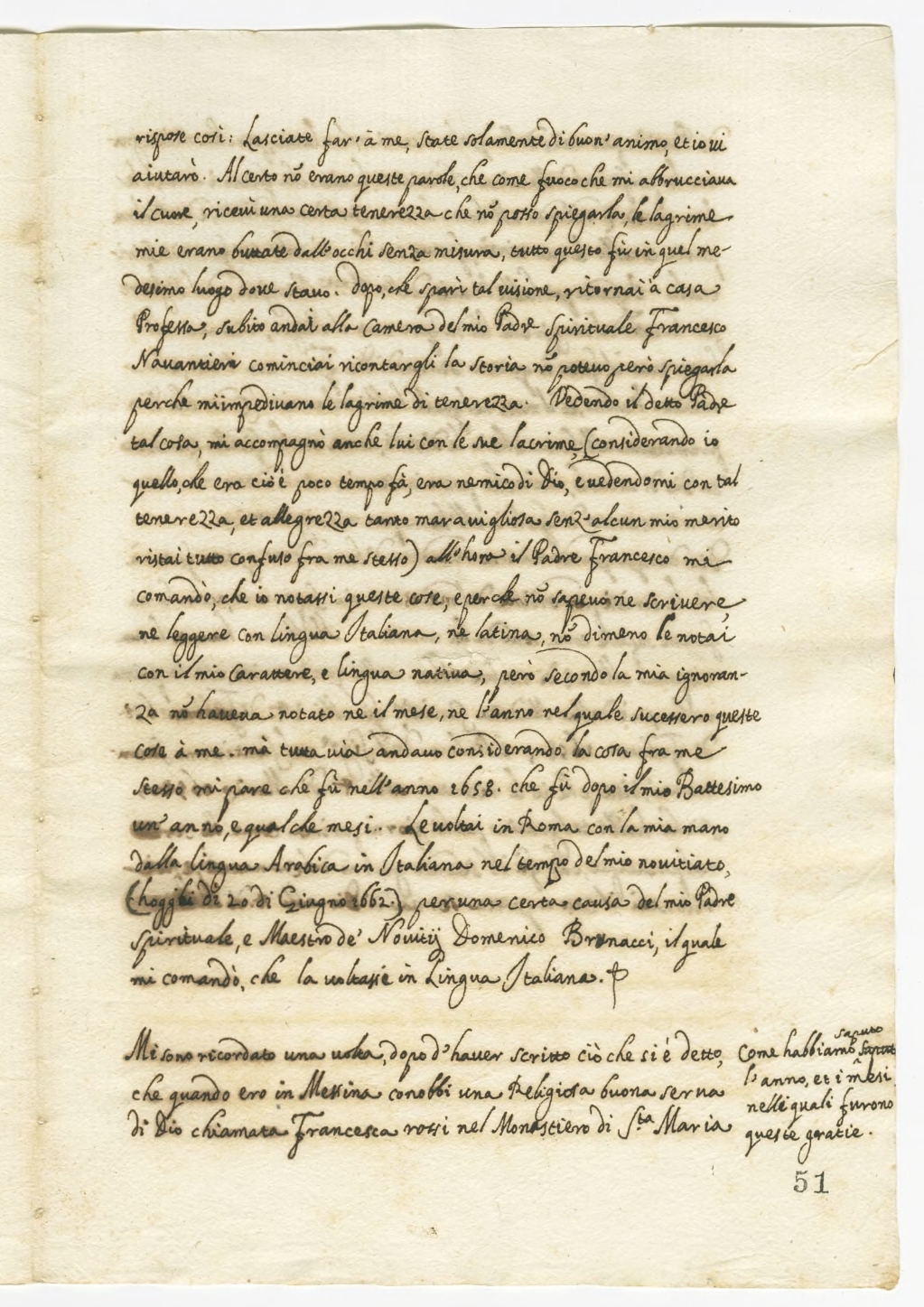 rispose così: lasciate far a me, state solamente di buon animo, et io vi aiutarò. Al certo non erano queste parole, che come fuoco che mi abbruciava il cuore, ricevì una certa tenerezza che non posso spiegarla, le lacrime mie erano buttate dall’occhi senza misura, tutto questo fu in quel medesimo luogo dove stavo. Dopo che sparì tal visione, ritornai a casa Professa, subito andai alla camera di mio Padre Spirituale Francesco Navantieri cominciai a raccontargli la storia non potevo però spiegarla perchè m’impedivano le lacrime di tenerezza. Vedendo il detto Padre tal cosa, mi accompagnò anche lui con le sue lacrime (considerando io quello che era, cioè poco tempo fa, era nemico di Dio, e vedendomi con tal tenerezza, et alegrezza tanto maravigliosa senz’alcun mio merito ristai tutto confuso fra me stesso) all’hora il Padre Francesco mi comandò, che io notassi queste cose, e perché non sapevo né scrivere né leggere con lingua Italiana ne latina, non dimeno le notai con il mio carattere, e lingua nativa, però secondo la mia ignoranza non aveva notato né il mese, né l’anno nel quale successero queste cose a me ma tuttavia andavo considerando la cosa fra me stesso mi pare che fu nell’anno 1658 che fu dopo il mio Battesimo un anno e qualche mesi. Le notai in Roma con la mia mano dalla lingua Arabica in Italiana nel tempo del mio noviziato (oggi di 20 di giugno 1662) per una certa causa del mio Padre Spirituale e Maestro dei Novitij Domenico Brunacci, il quale mi comandò, che la voltasse in lingua italiana.
