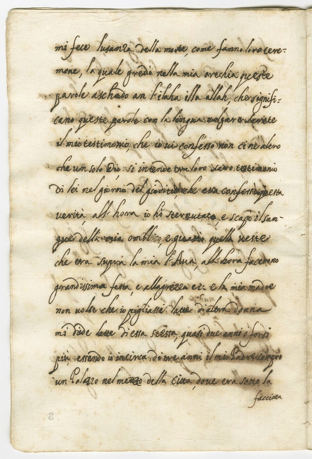 mi fece lusanza della morte, come fanno loro ceremonie, la quale gredò nella mia orechia queste parole aschado an l'ilaha illa allah, che significano queste parole con la lingua volgare sarete il mio testimonio, che io vi confesso non ce ne altro che un solo Dio, si intende tra loro saro testimonio di lei nel giorno del giudizio, che essa confessò questa verità, all’hora io ho sternutato[1], e scapò il sangue della mia omblica, e guastò quella veste che era supra la mia l'Ava, all'hora facerono grandissima festa e allagrezza ec: e la mia madre non volse che io pigliassi latte d’altra donna mi diede latte di essa stessa, quasi due anni ò forse più, essendo io incirca di tre anni il mio Padre comprò un Palazo nel mezzo della citta, dov’era sotto la
