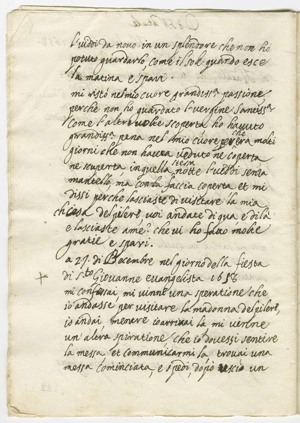A 21 di Decembre nel giorno dell fiesta di Santo Giovanne evangelista 1658 mi confessai, mi vinne una speratione che io andasse per visitare la madonna del pilere, io andai, mentre io arrivai la mi venne un'altra spiritaione che io dovessi sentire la messa et communicarmi la trovai una messa cominciata, e spedi, dopò escì un