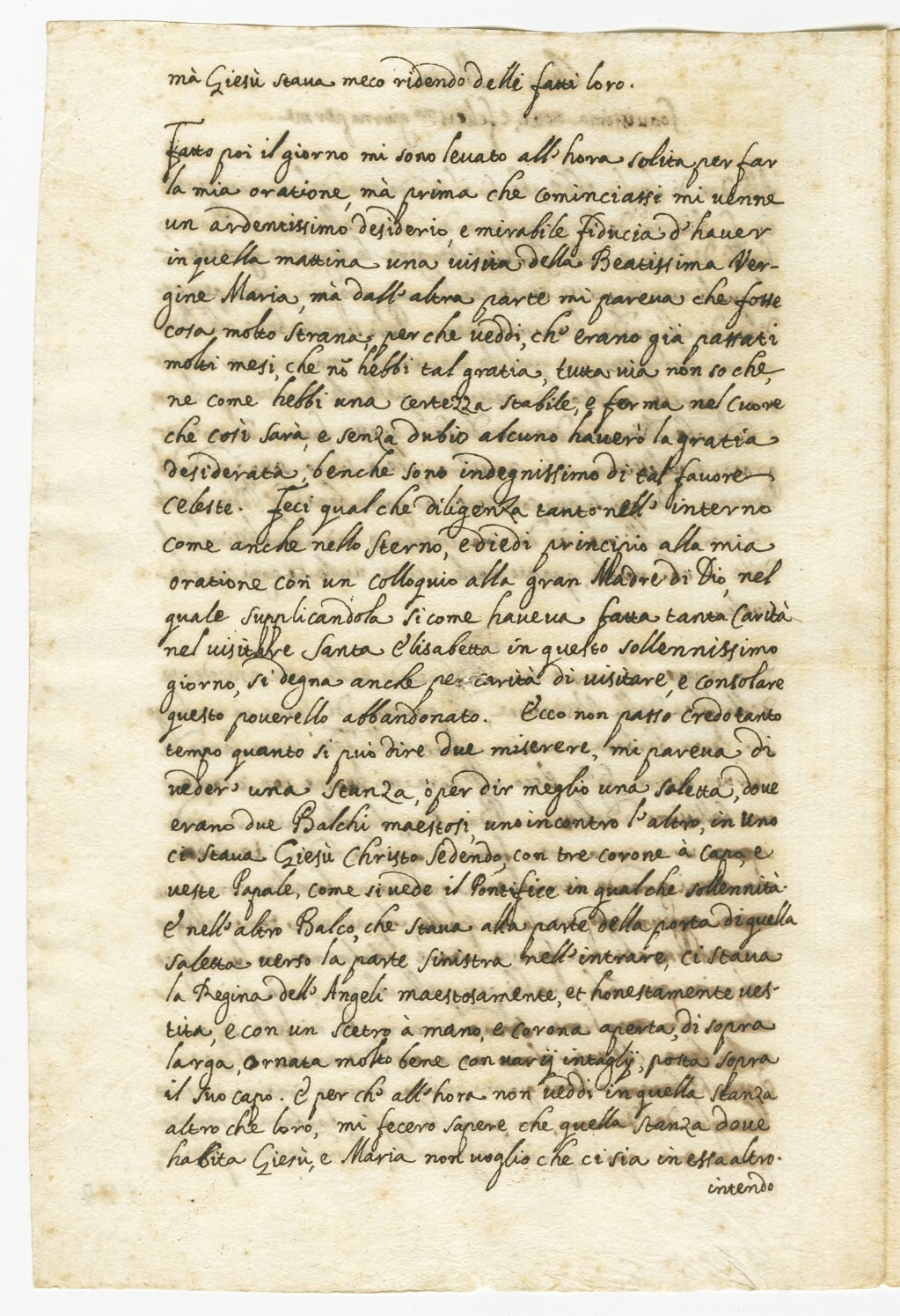 Fatto poi il giorno mi sono levato all'hora solita per far mia oratione mà prima che cominciassi mi venne un ardentissimo desiderio e mirabile fiducia d'haver in quella mattina una visita della Beatissima Vergine Maria, mà dall'altra parte mi pareva che fosse cosa molto strana per che veddi ch'erano già passati molti mesi che non hebbi tal gratia, tutta via non so che ne come hebbi una certezza stabile e forma nel cuore che così sarà, e senza dubio alcuno haverò la gratia desiderata benche sono indegnissimo di tal favore celeste. Feci qualche diligenza tanto nell'interno come anche nello sterno, e diedi principio alla mia oratione con un colloquio alla gran Madre di Dio, nel quale supplicandola si come haveva fatta tanta carità nel visitare Santa Elisabetta in questo sollennissimo giorno, si degna ancha per carità di visitare e consolare questo poverello abbandondato. Ecco non passò credo tanto tempo quanto si può dire due miserere, mi pareva di veder'una stanza, ò per dir megio una saletta, dove erano due Balchi maestosi, uno incontro l'altro, in uno ci stava Giesù Christo sedendo con tre corone à capo e veste Papale, come si vede il Pontefice in qualche solennità. E nell'altro Balco, che stava alla parte della porta di quella saletta verso la parte sinistra nell'intrare, ci stava la Regina dell'Angeli mestosamente et honestamente vestita, e con un scetro à mano e corona aperta, di sopra larga, ornata molto bene con varij intaglij, porta sopra il suo capo. Et per ch' all'hora non veddi in quella stanza altro che loro, mi fecero sapere che quella stanza sove habita Giesù e Maria non voglio che ci sia in essa altro