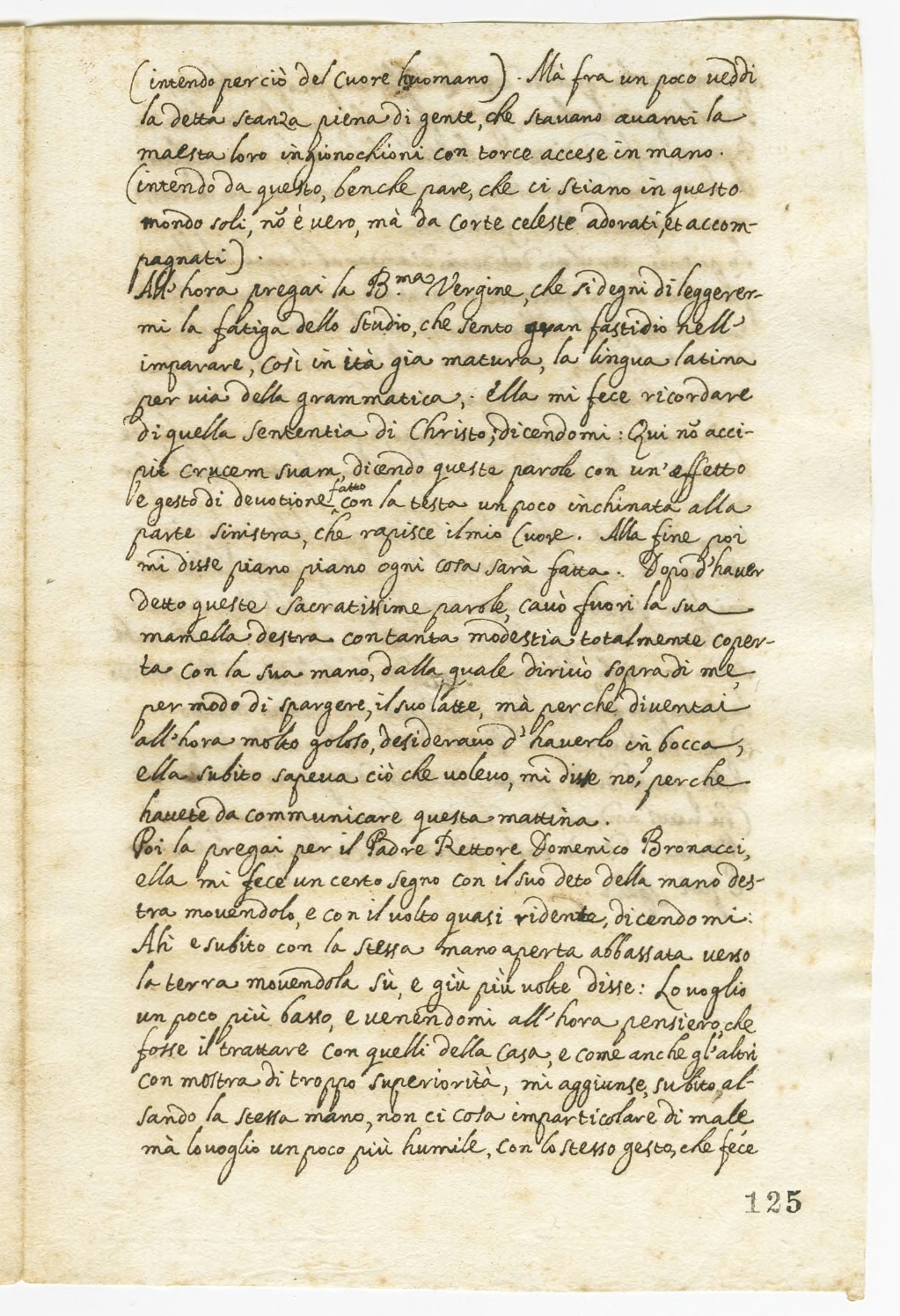 Poi la pregai per il Padre Rettore Domenico Bronacci, ella mi fece un certo segno con il suo deto della mano destra movendolo, e con il volto quasi ridente, dicendomi Ah, e subito con la stessa mano aperta abbassata verso la terra movendola su, e giù più volte disse: Lo voglio un poco più basso, e vedendomi allora il pensiero che fosse il trattare con quelli della casa, e come anche gl’altri con mostra di troppa superiorità, mi aggiunse, subito alzando la stessa mano, non c’è cosa in particolare di male ma lo voglio un poco più humile, con lo stesso gesto che fece