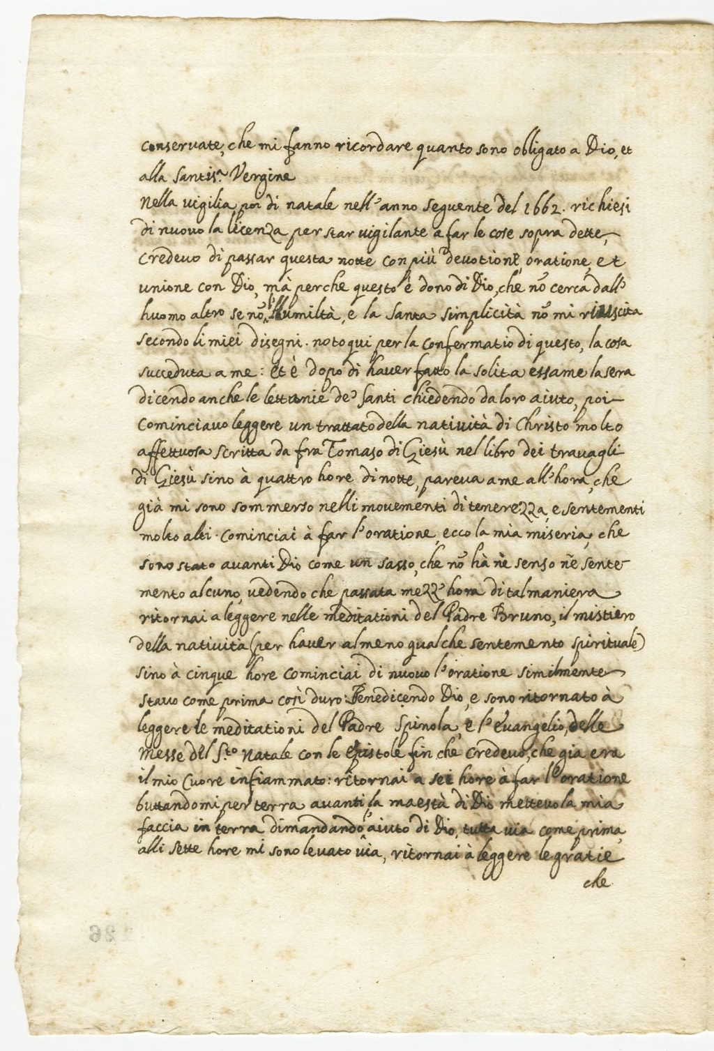Nella vigilia poi di natale dell'anno seguente del 1662 richiesi di nuovo la licenza per star vigilante a far le cose sopra dette, credevo di passar questa notte con più devotione, oratione et unione con Dio, mà perche questo è dono di Dio, che non cerca dall'huomo altro se non l'humiltà, e la Santa simplicità non mi riuscita secondo le miei disegni. Noto qui per la confermatio di questo, la cosa succeduta a me: et è dopo di haver fatto la solita essame la sera dicendo anche le lattanie de'Santi chiedendo da loro aiuto, poi cominciavo leggere un trattato della natività di Christo molto affetuosa scritta da fra Tomaso di Giesù nel libro dei travagli di Giesù[1] sino à quattro hore di notte, pareva a me all'hora, che già mi sono sommerso nelli movementi di tenerezza e sentementi molto alti. Cominciai à far l'oratione, ecco la mia miseria che sono stato avanti Dio come un sasso, che non hà nè senso nè sentemento alcuno, vedendo che passata mezz'hora di tal maniera ritornai a leggere nelle meditationi del Padre Bruno, il mistiero della natività (per haver al meno qualche sentemento spirituale) sino a cinque hore cominciai di nuovo l'oratione similmente stavo come prima così duro Benedicendo Dio e sono ritornato à leggere le meditationi del Padre Spinola e l'evangelio delle messe del Santo Natale con le epistole fin che credevo che cia era il mio cuore infiammato, ritornai a sei hore à far l'oratione buttandomi per terra avanti la maestà di Dio mettevo la mia faccia in terra dimandando aiuto di Dio, tutta via come prima alli sette hore mi sono levato via, ritornai à leggere le gratie