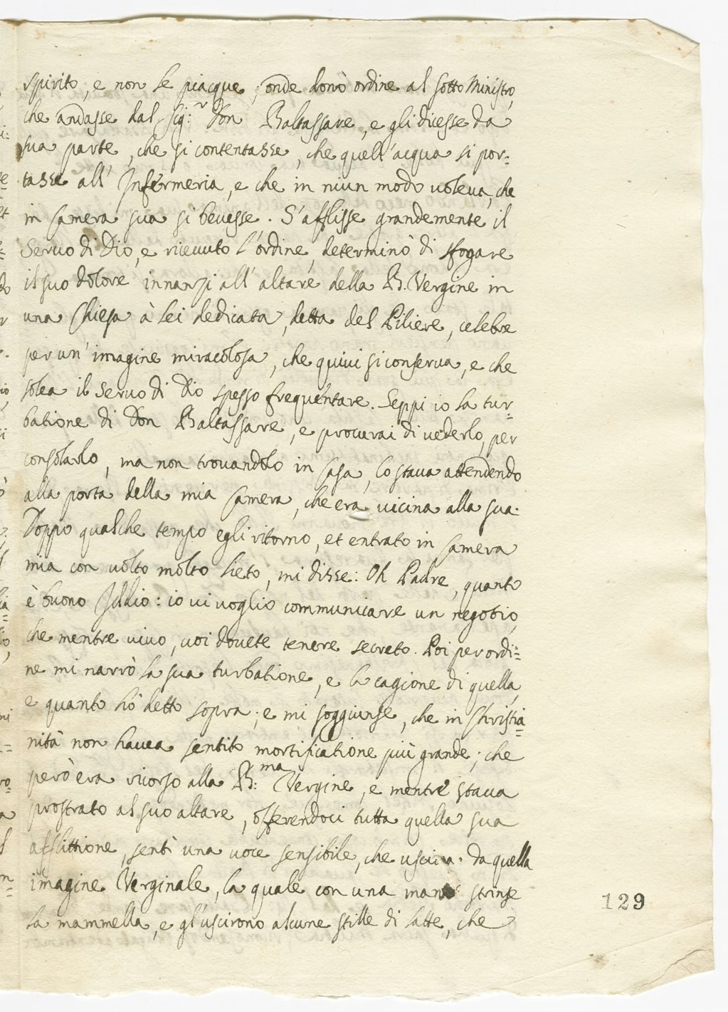 spirito, e non le piacque; onde donò ordine al Sotto Ministro che andasse dal Signor Don Baldassare e gli dicesse da sua parte che si contetasse, che quell'acqua si portasse all'infermeria, e che in niun modo voleva che in Camera sua si bevesse. S'afflisse grandemente il Servo di Dio e ricevuto l'ordine, determinò di sfogare il suo dolore innanzi all'altare della Beata Vergine in una Chiesa à Lei dedicata, della del Piliere, celebre per un'imagine miracolosa, que quivi si conserva, e che solea il Servo di Dio spesso frequentare. Seppi io la turbatione di Don Baldassare, e procurai di vederlo per consolarlo, ma non trovandolo in Casa, lo stava attendendo alla porta della mia Camera, era vicina alla sua.
