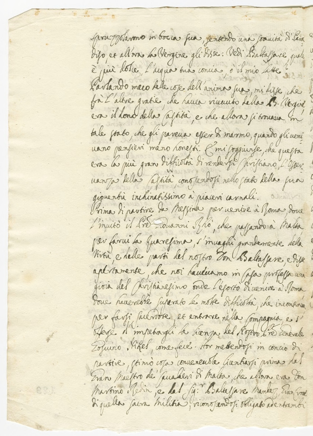 Prima di partire da Messina, per venire à Roma dove l'invitò il Padre Giovanni Rhò, che passando à Malta per farvi la quaresima, s'invaghì grandemente della virtù e delle parti del nostro Don Baldassare, e disse apertamente che noi havevamo in Casa professa una gioia del Christianesimo, onde l'esortò di venire à Roma, dove haverebbe superato le molte difficoltà che incontrava per farsi Sacerdote, et entrare nella Compagnia e s'offerse d'impetargli la licenza del Nostro Padre Generale Gojuino Nikel, come fece. Hor mettendosi in concio di partire, stimò cosa convenevole licensiarsi prima dal Gran Maestro de Cavalieri di Malta, che allora era Don Martino Redin e del Signor Baldassare Mendez, Gran Croce di quella sacra militia, riconoscendosi obbligato ad entrambi