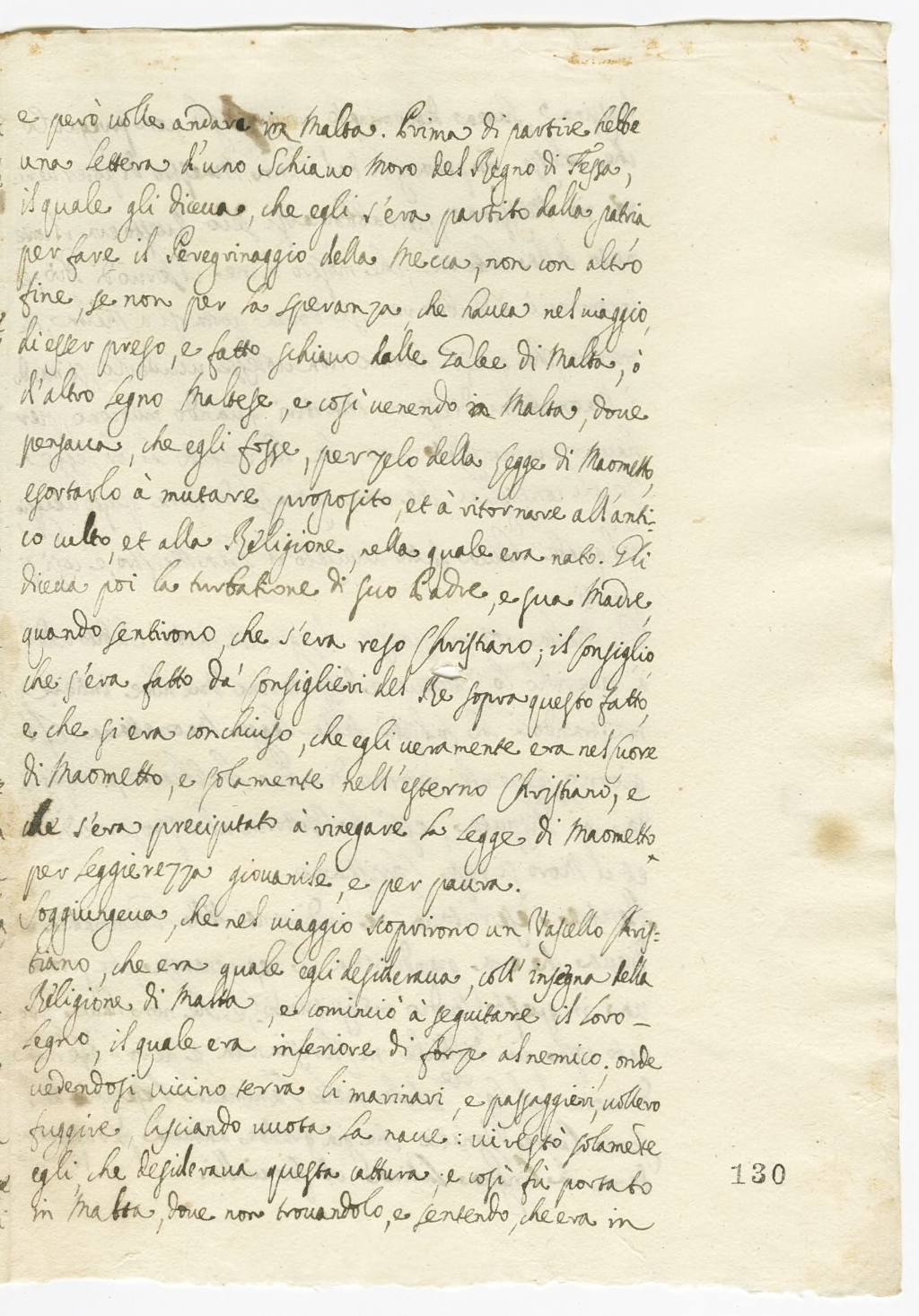 e però volle andare a Malta. Prima di partire hebbe una lettera d’uno schiavo moro del regno di Fessa, il quale gli diceva, che egli s’era partito dalla patria, per fare il pellegrinaggio alla Mecca, non con altro fine, se non per la speranza che havea nel viaggio di esser preso, e fatto schiavo dalle Galee di Malta o d’altro legno Maltese, e così venendo in Malta, dove pensava che egli fosse, per zelo della legge di Maometto, esortarlo a mutare proposito, et a ritornare all’antico culto et alla Religione, nella quale era nato[1]. Gli diceva poi la turbatione di suo Padre, e sua Madre, quando sentirono che s’era fatto Christiano; il consiglio che s’era fatto da’ consiglieri del Re sopra questo fatto, e che si era conchiuso, che egli veramente era nel cuore di Maometto, e solamente nell’esterno Christiano, e che s’era precipitato a rinnegare la legge di Maometto per leggierezza giovanile, e per paura.