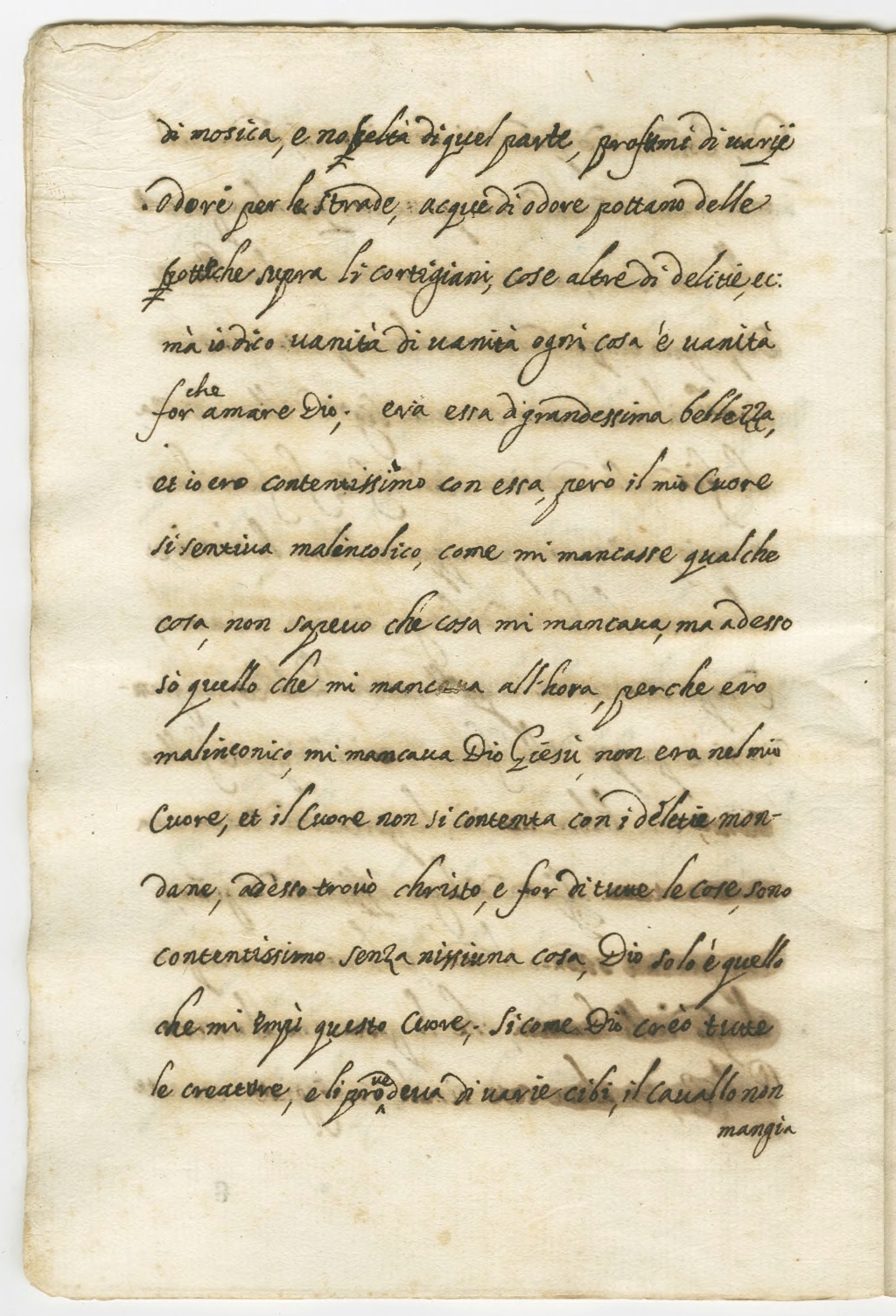 di mosica, e noveltà di quel parte, profumi di varii odori per le strade, acque di odore portano delle bottiche supra le cortigiani, cose altre di delitie, ec: mà io dico vanità di vanità ogni cosa è vanità[1] for che amare Dio; era essa di grandessima bellezza ed io ero contentissimo con essa, però il mio cuore si sentiva malinconico[2], come mi mancasse qualche cosa, non sapevo che cosa mi mancava, ma adesso sò quello che mi mancava all’hora perche ero malinconico, mi mancava Dio Giesù, non era nel mio Cuore, et il Cuore non si contenta con i deletie mondane, adesso trovò christo, e for di tutte le cose, sono contentissimo senza nissiuna cosa, Dio solo è quello che mi empì questo Cuore; si come Dio creò tutte le creature, e li provedeva di varie cibi, il cavallo non