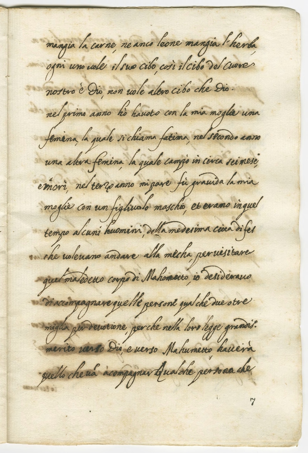 nel primo anno hò avuto con la mia moglie una femina, la quale si chiama Fatima, nel secondo anno un’altra femina, la quale campò in circa sei mesi e morì, nel terzo anno mi pare fù gravida la mia moglie con un figliuolo maschio, et era in quel tempo alcuni huomini, della medesima città di Fes che volevano andare alla mecha, per visitare quel maledetto corpo di Mahometto[1], io desideravo di accompagnare quelle persone qualche due o tre miglia per devotione, perche nella loro legge grandissimo merito verso Dio e verso Mahumetto haverà quello che và accompagnar Qualche persona che
