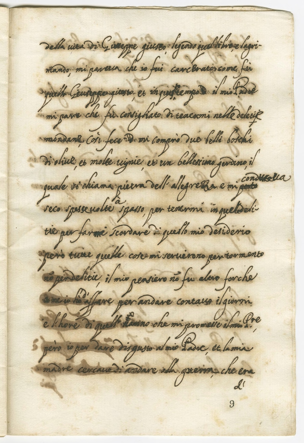 della vita di Giuseppe giusto, legendo quel libro lagrimando, mi pareva che io fui carcerato come fù quell Giuseppe giusto[1], et in questo tempo il mio Padre mi pare che fù consigliato di tenermi nelle deletie mondane, così fece, mi comprò due belli boschi di olive, et molte vigne, et un bellissimo giardino il quale si chiama pietra dell’allegrezza[2] e mi portoconduceva seco spesse volte a spasso per tenermi in quelle delitie per farmi scordare di quello mio desiderio, però tutte quelle cose mi servirono per tormento, non per delitie, il mio pensiero non fu altro forche come io ho d’affare per andare contavo il giorni e l’hore di quell'hanno che mi promesse il mio Padre però io per dare disgusto a mio Padre et la mia madre cercavo di andare alla guerra, che era