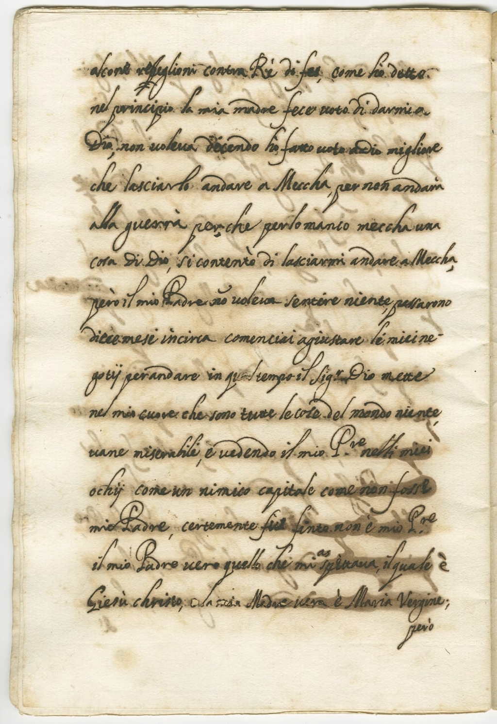 alcone repbeglioni contra Rè di Fes; come hò detto nel principio la mia madre fece voto di darmi a Dio; non voleva dicendo hò fatto voto a Dio migliore che lasciarlo andare a Meccha, per non andar alla guerrà per che per lo manco meccha una cosa di Dio, si contentò di lasciarmi andare a Meccha, però il mio Padre non voleva sentire niente, passarono diece mesi incirca comenciai agiustare li miei negotii per andare, in quel tempo il Signore Dio mette nel mio cuore che sono tutte le cose del mondo niente, vane miserabili, e vedendo il mio Padre nelli miei ochii come un nimico capitale come non fosse mio Padre, certamente fù finto, non è mio Padre, il mio Padre vero quello che mi aspettava il quale è Giesù christo, e la mia Madre vera è Maria Vergine;