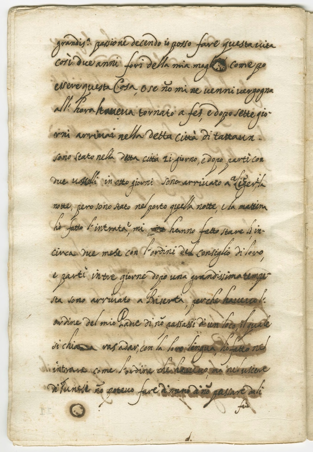 grandissima passione dicendo io posso fare questa vita così due anni fori dalla mia moglie come per essere questa cosa e se non mi ne venni vergogna all’hora aveva tornato a Fes, e dopo sette giorni arrivai nella detta città di Tattaun. Sono stato nella detta città 11 giorni, e dopo partì con due vascelli in otto giorni sono arrivato a Aligeri, la notte, pero sono stato nel porto quella notte, e la mattina hò fatto l’intrata e mi hanno fatto stare lì in circa due mese con l’ordini del Consiglio di loro, e partì in tre giorne dopo una grandissima tempesta, sono arrivato a Bisertà, perche havevo l’ordine del mio Padre di non passassi di un loco, il quale si chiama Rasadar, con la loro lingua, hò fatto nel intrare come l’ordine che havevo, ma nel’uscire di Tunesi non potevo fare di meno di non passare da lì