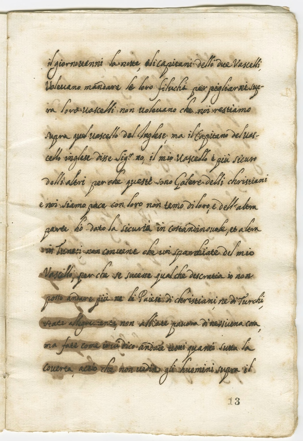 il giorno, venni la notte e li capitani dei due vascelli, volevano mandare le loro filuchi per pigliarmi supra loro vascelli non volevano che noi restiamo supra quel vascello del Inglese, ma il Capitano del vascello inglese disse Signor no, il mio vascello è più sicuro delli altri perché questi sono Galere delli christiani e noi siamo pace con loro, non temo di loro, e dell’altra parte hò dato la sicurtà in Costandinovole, et altra in Tunesi, non convene che voi sparchiate dal mio vascello, perché se successe qualche discratia io non posso andare più nelli Paiesi de’ christiani, né di Turchi. State allegremente, non abbiate paura di nessuna cosa ma fate come io vi dico, andate tutti quanti sutta la coverta, acciò che non vedino li uomini supra il
