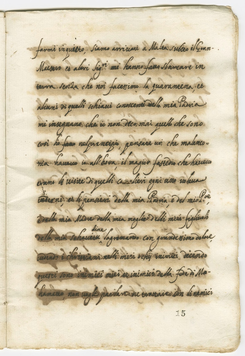 farmi inquieto. Siamo arrivati a Malta, subito il Gran Maestro ed altri signori mi hanno fatto sbarcare in terra senza che noi facessimo la quarantena ed alcuni di quelli schiavi conoscenti della mia patria mi insegnano che io non dico mai quello che sono, così ho fatto nel principio, pensate voi che malenconia avevo io all’hora, il magior fastedio che havevo erano le visite di quelli cavalieri ogni uno voleva vedermi, et li pensieri della mia Padria, del mio Padre e della mia Madre, della mia moglie delli miei figliuoli della mia schiavitù. Dissi lagremando con grandissimo dolore vedendo i christiani nelli miei occhi inimici dicendo questi sono inimici miei et inimici della fede di Mohametto, non voglio parlare né trattare con li nimici