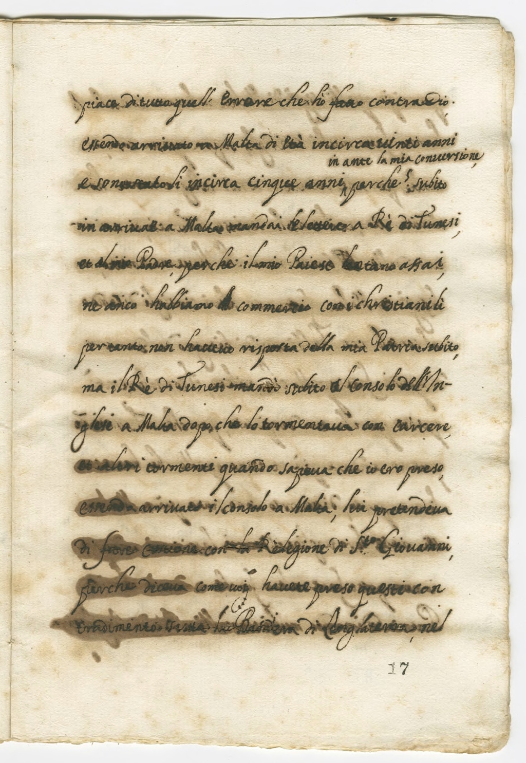 piace di tutto quell’errore che ho fatto contra Dio. Essendo arrivato a Malta di età incirca vinti anni e sono stato lì incirca cinque anni in ante la mia conversione, perché? subito in arivare a Malta mandai le lettere al Rè di Tunesi et al mio Padre, perché il mio Paiese era lontano assai, ne anco habbiamo commercio con i christiani lì per tanto non avevo risposta dalla mia Patria subito, ma il Rè di Tunisi mandò subito al consolo dell’Inglesi a Malta dopo che lo tormentava con carcere ed altri tormenti quando sapeva che io ero preso. Essendo arrivato il consolo a Malta, lui pretendeva di fare custione con la Religione di San Giovanni perché diceva: come voi avete preso questi con il tradimento se sta la Bandiera di L'Inglaterra nel
