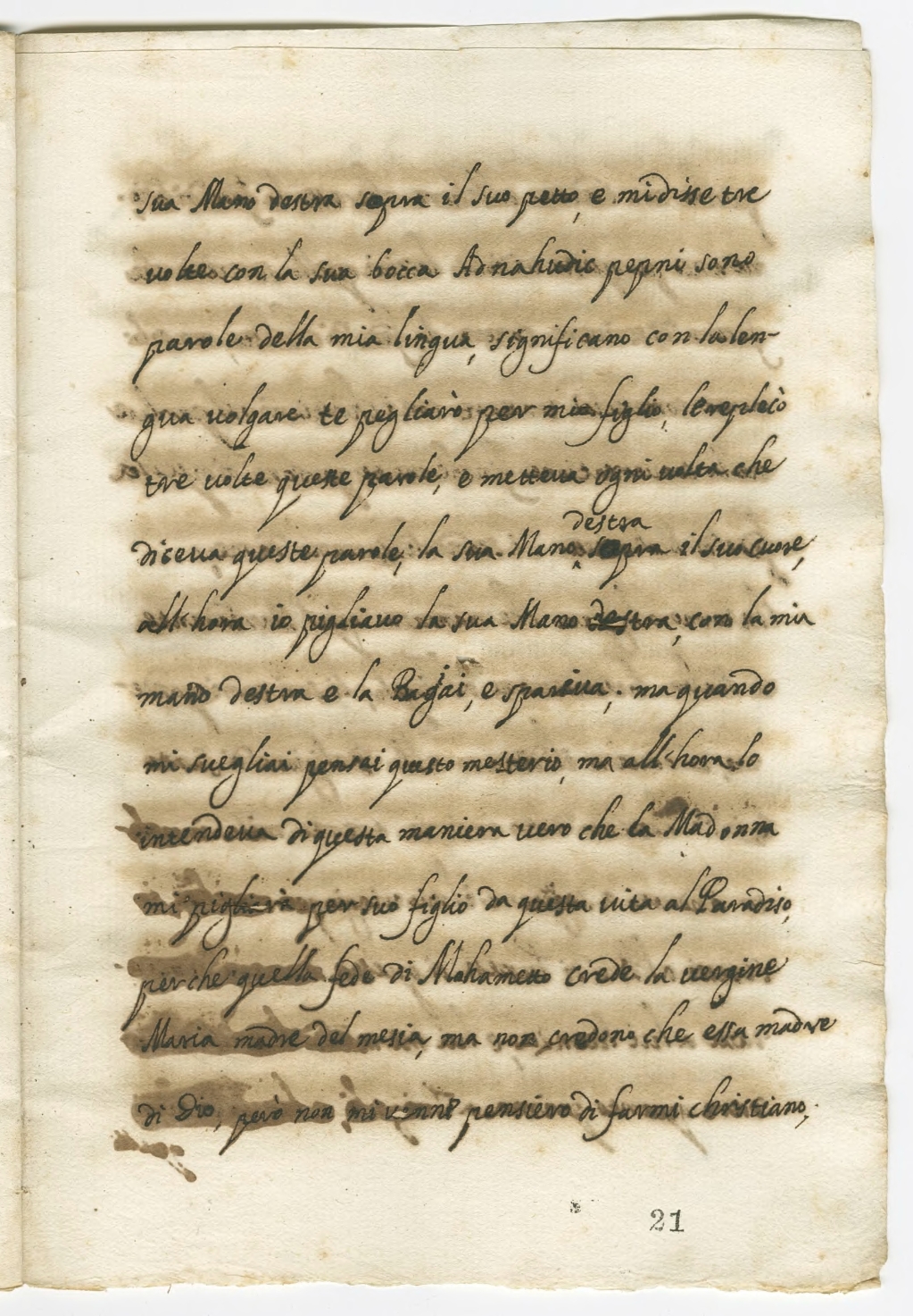 sua mano destra sopra il suo petto, e mi disse tre volte con la sua bocca Ad nahudic pepni, sono parole della mia lingua significano con la lengua volgare ti pegliarò per mio figlio, le replicò tre volte queste parole, e metteva ogni volta che diceva queste parole la sua Mano destra supra il suo cuore, all'hora io pigliavo la sua Mano destra con la mia mano destra e la baciai, e spariva, ma quando mi svegliai pensai questo mesterio, ma all'hora lo intendeva di questa maniera vero che la Madonna mi pigliarà per suo figlio da questa vita al Paradiso, perché quella fede di Mahametto crede la Vergine Maria madre del mesia ma non credono che essa sia madre di Dio, però non mi venne pensiero di farmi christiano,