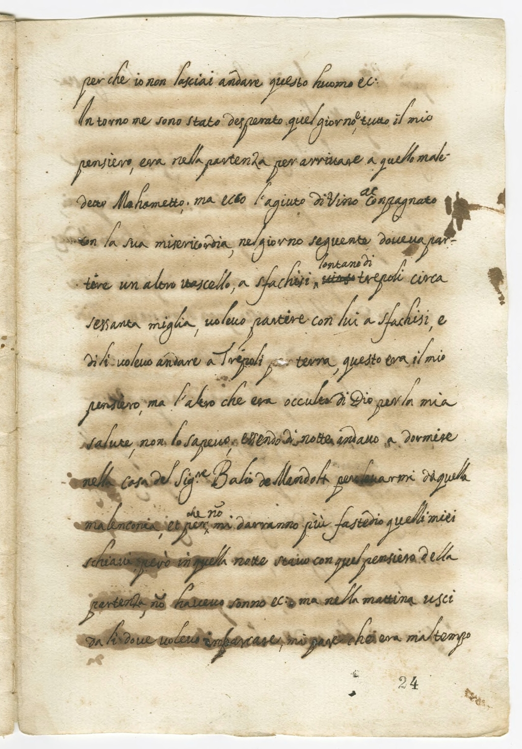 In torno me sono stato desperato quel giorno, e tutto il mio pensiero era nella partenza per arrivare a quello maledetto Mahometto, ma ecco l’agiuto di Vino accompagnato con la sua misericordia, nel giorno seguente doveva partire un altro vascello, a Sfachisi, lontano di Trepoli circa sessanta miglia, volevo partire con lui a Sfachisi, e di lì volevo andare a Trépoli per terra, questo era il mio pensiero, ma l’altro che era occulto di Dio per la mia salute, non lo sapevo, essendo di notte andavo a dormire nella casa del Signore Bali de Mandolx per levarmi da quella malenconia et per che non mi daranno più fastedio quelli miei schiavi, però in quella notte stavo con quel pensiero della partenza, non avevo sonno ecc., ma nella mattina usci da lì dove volevo imbarcare, mi pare che era mal tempo