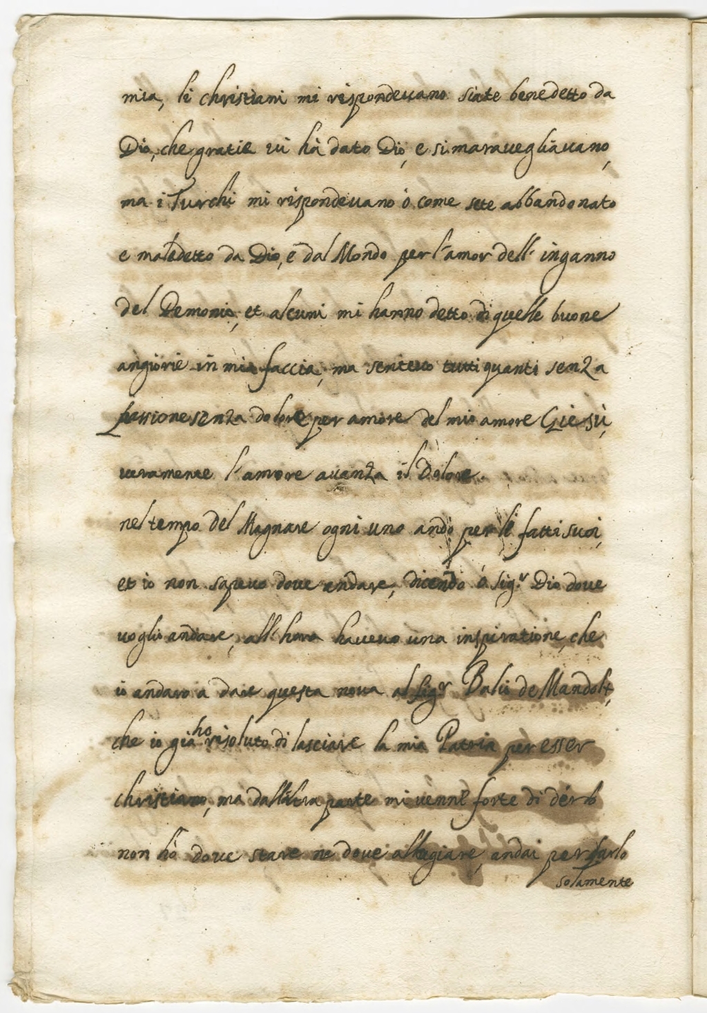 mia, li christiani mi rispondevano siate benedetto da Dio, che gratia vi ha dato Dio, e si maravigliavano ma i Turchi mi rispondevano o come siete abbandonato e maledetto da Dio, e dal mondo per l’amor dell’inganno del Demoni, et alcuni mi hanno detto di quelle buone ingiurie in mia faccia, ma sentivo tutti quanti senza passione, senza dolore per amore del mio amore Giesù veramente l’amore avanza il dolore.