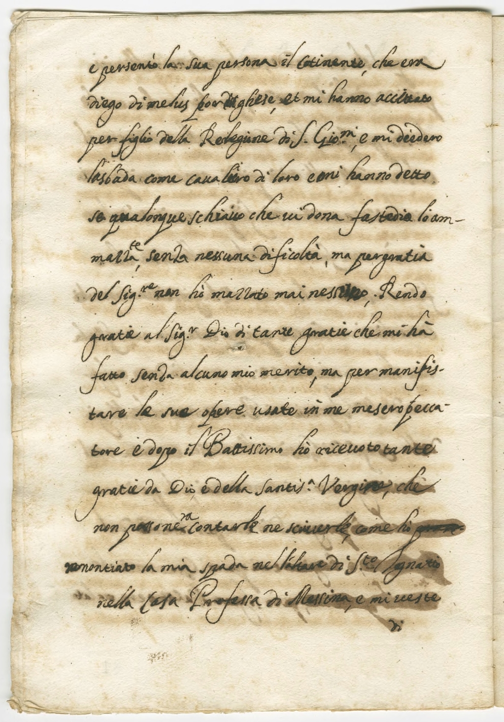 e presentò la sua persona il cotinente, che era Diego di Melus portoghese, et mi hanno accettato per figlio della Religione di San Giovanni, e mi diedero la sbada come cavaliero di loro e mi hanno detto se qualunque schiavo che vi dona fastedio lo ammazzate senza nessuna difficoltà, ma per gratia del Signore non ho ammazzato mai nessuno. Rendo gratie al Signore Dio di tante gratie che mi ha fatto senza alcuno mio merito, ma per manifestare le sue opere usate in me mesero peccatore e dopo il Battesimo ho ricevuto tante gratie da Dio e dalla Santissima Vergine, che non posso contarle ne scriverle, come ho renontiato la mia spada nell’altare di Santo Ignatio nella Casa Professa di Messina, e mi veste