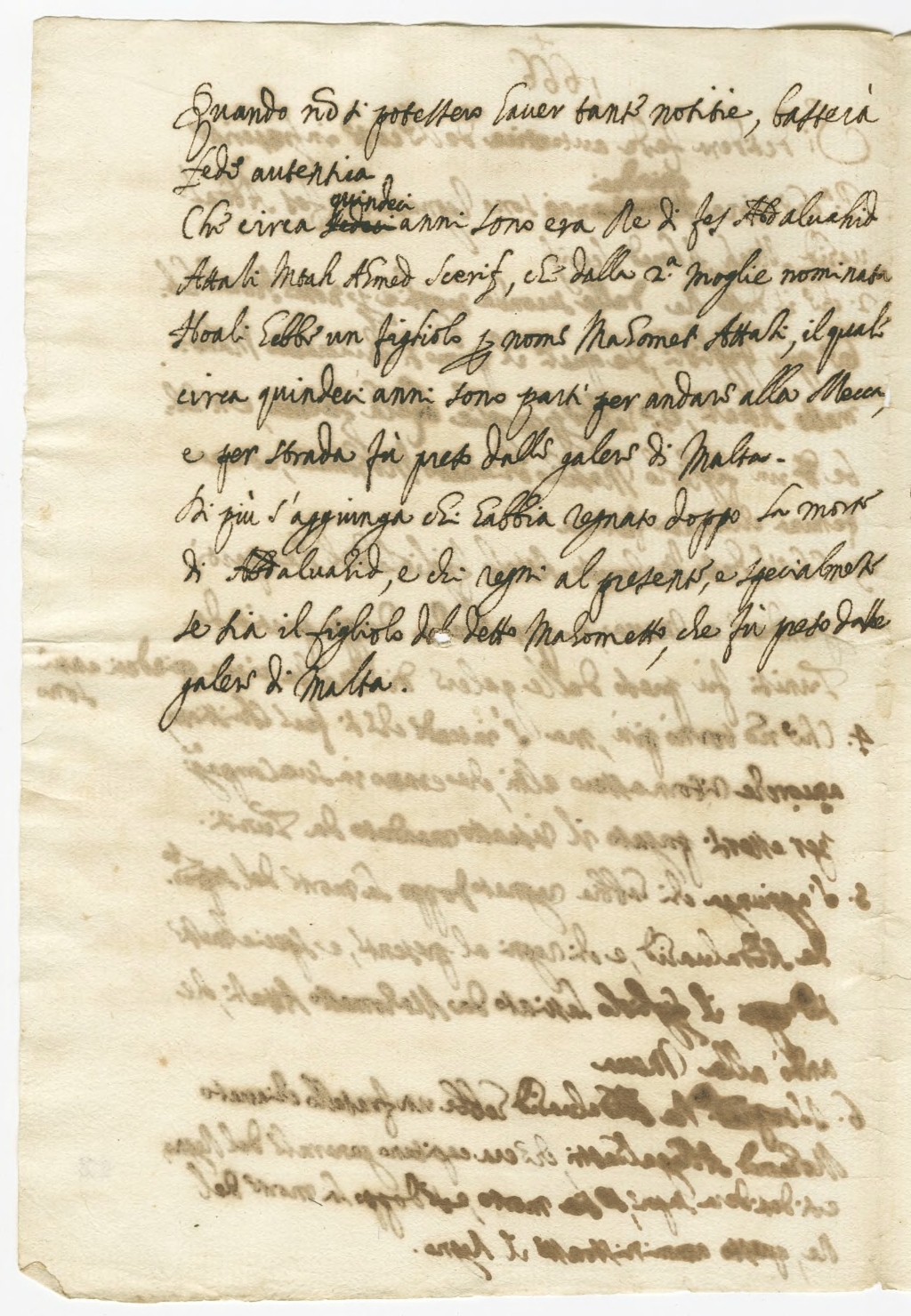 Che circa quindeci anni sono era Re di Fes Abdaluahid Attali Moah Ahmed Scerif, che dalla 2a moglie nominata Hoali hebbe un figliolo per nome Mahomed Attazi, il quale circa quindeci anni sono partì per andare alla Mecca e per strada fù preso dalle galere di Malta.