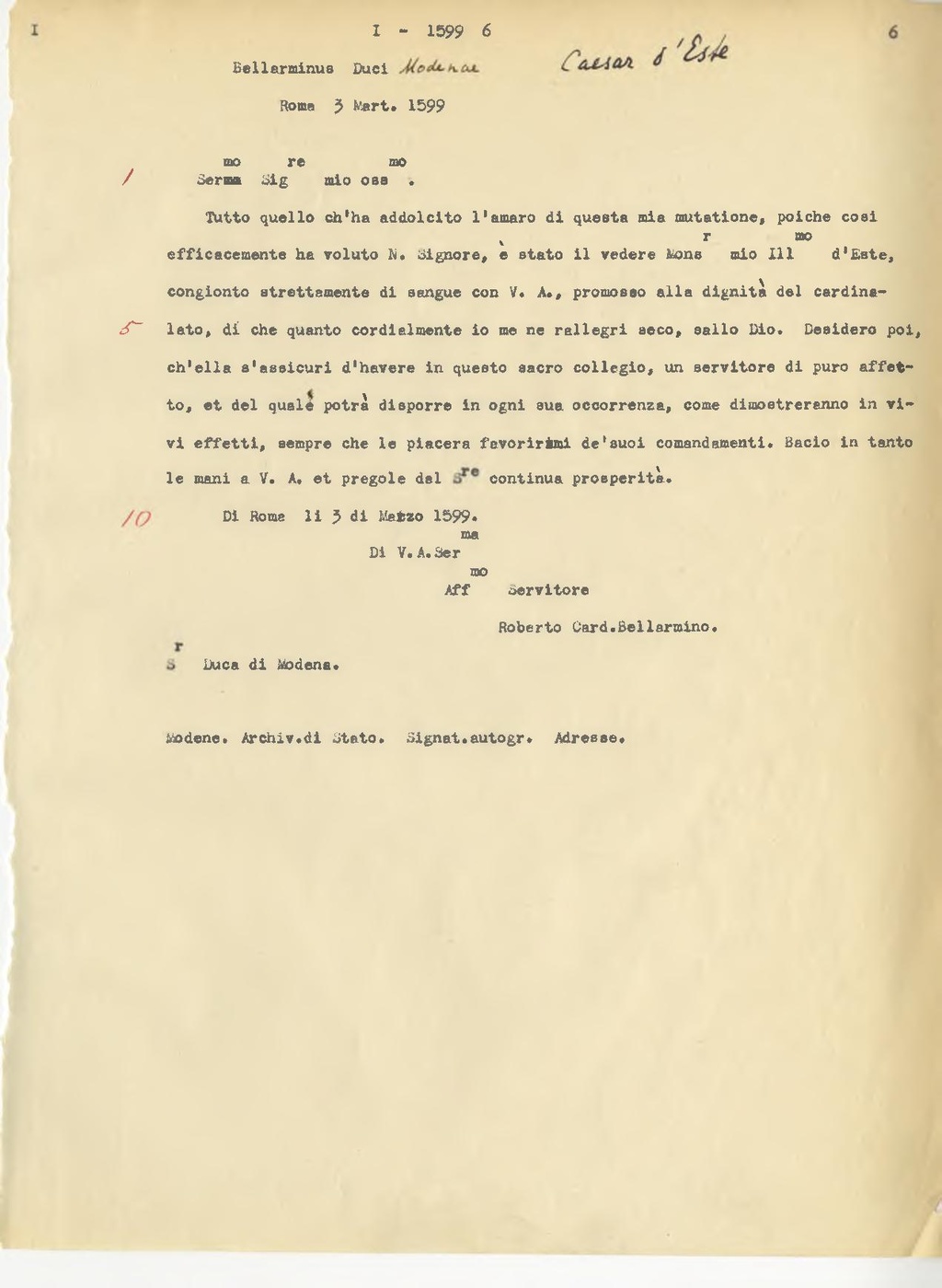 Tutto quello ch'ha addolcito l'amaro di questa mia mutatione, poiché così efficacemente ha voluto N. Signore, è stato il vedere Mons.r mio Ill.mo d'Este, congionto strettamente di sangue con V. A., promosso alla dignità del cardinalato, di che quanto cordialmente io me ne rallegri seco, sallo Dio. Desidero poi, ch'ella s'assicuri d'havere in questo sacro collegio, un servitore di puro affetto, et del quale potrà disporre in ogni sua occorrenza, come dimostreranno in vivi effetti, sempre che le piacerà favorirmi de' suoi comandamenti. Bacio in tanto le mani a V. A. et pregole dal S.re continua prosperità.