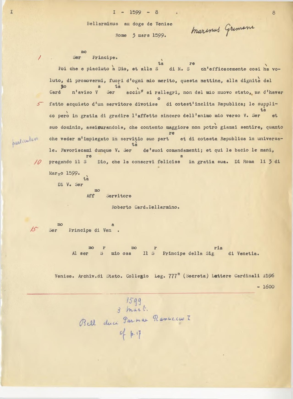 Poi che è piaciuto a Dio, et alla S.tà di N. S.re ch'efficacemente così ha voluto , di promovermi, fuori d'ogni mio merito, questa mattina, alla dignità del Card.to n'aviso V.a Ser.tà acciò si rallegri, non del mio nuovo stato, ma d'haver fatto acquisto d'un servitore divotiss.o di cotest'inclita Republica; le supplico però in gratia di gradire l'affetto sincero dell'animo mio verso V. Ser.tà et suo dominio, assicurandola, che contento maggiore non potrò giamai sentire, quanto che veder m'impiegato in servitio suo part.re et di cotesta Republica in universale. Favoriscami dunque V. Ser.tà de' suoi comandamenti; et qui le bacio le mani, pregando il S.re Dio, che la conservi feliciss.a in gratia sua. Di Roma li 3 di Marzo 1599.