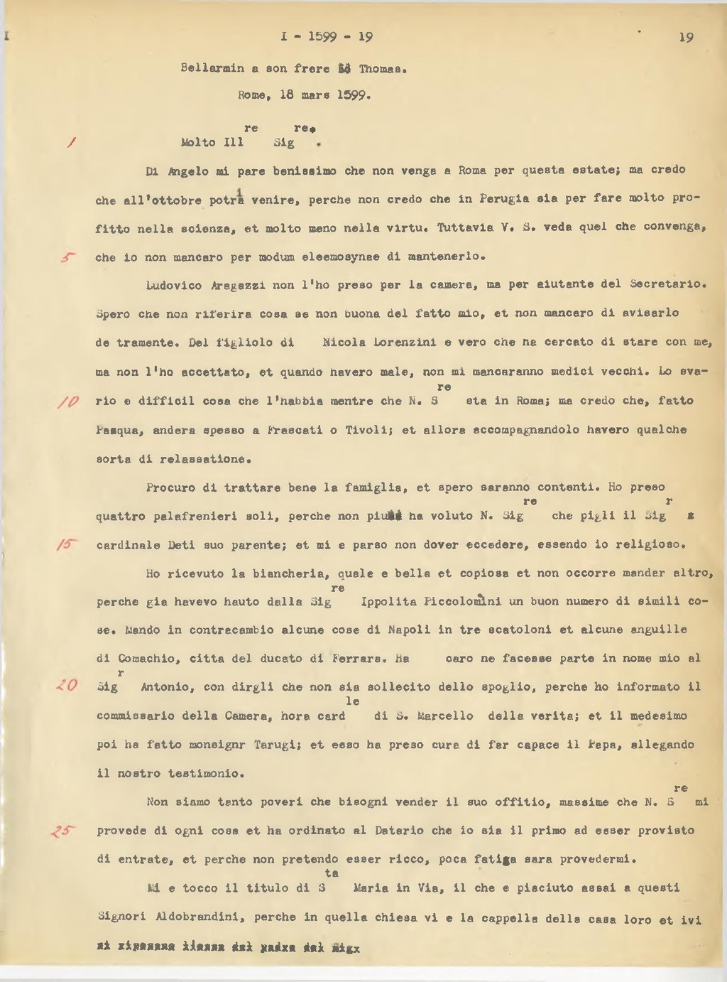 Ludovico Aragazzi non l'ho preso per la camera, ma per aiutante del Secretario. Spero che non riferirà cosa se non buona del fatto mio, et non mancarò di avisarlo de tramente. Del figliolo di Nicola Lorenzini è vero che ha cercato di stare con me, ma non l'ho accettato, et quando haverò male, non mi mancaranno medici vecchi. Lo svario è difficil cosa che l'habbia mentre che N. S.re sta in Roma; ma credo che, fatto Pasqua, anderà spesso a Frascati o Tivoli; et allora accompagnandolo haverò qualche sorta di relassatione.