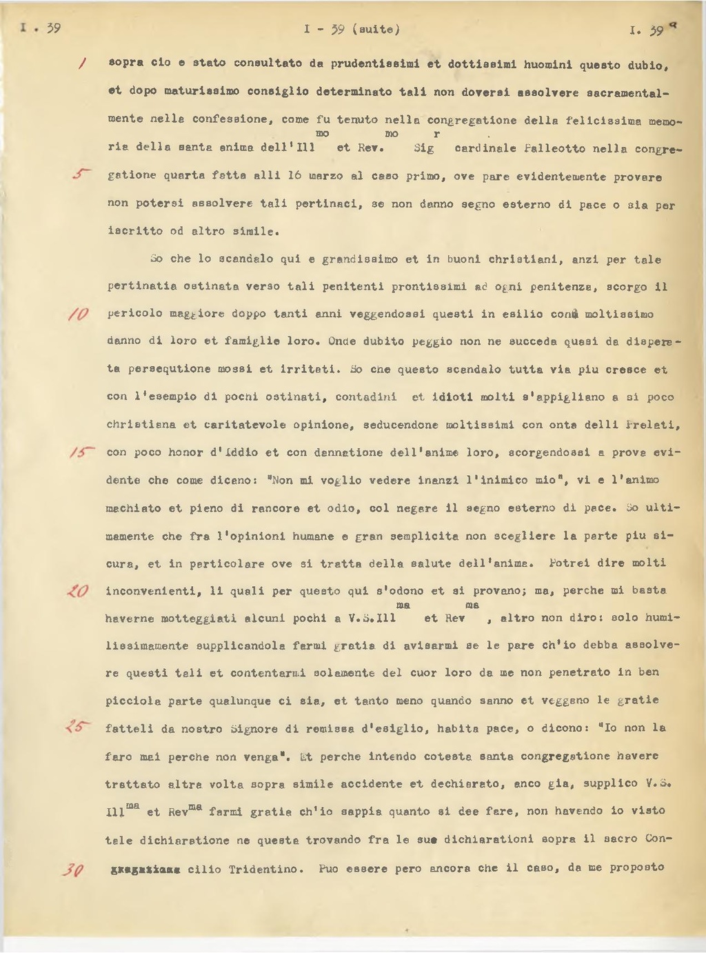 So che lo scandalo qui è grandissimo et in buoni christiani, anzi per tale pertinatia ostinata verso tali penitenti prontissimi ad ogni penitenza, scorgo il pericolo maggiore dopo tanti anni veggendossi questi in esilio con moltissimo danno di loro et famiglie loro. Onde dubito peggio non ne succeda quasi da disperata persequtione mossi et irritati. So che questo scandalo tutta via più cresce et con l'esempio di pochi ostinati, contadini et idioti molti s'appigliano a sì poco christiana et caritatevole opinione, seducendone moltissimi con onta delli Prelati, con poco honor d'Iddio et con dannatione dell'anime loro, scorgendossi a prova evidente che come dicano: "Non mi voglio vedere inanzi l'inimico mio", vi è l'animo machiato et pieno di rancore et odio, col negare il segno esterno di pace. So ultimamente che fra l'opinioni humane è gran semplicità non scegliere la parte più sicura, et in particolare ove si tratta della salute dell'anima. Potrei dire molti inconvenienti, li quali per questo qui s'odono et si provano; ma, perché mi basta haverne motteggiati alcuni pochi a V. S. Ill.ma et Rev.ma, altro non dirò: solo humilissimamente supplicandola farmi gratia di avisarmi se le pare ch'io debba assolvere questi tali et contentarmi solamente del cuor loro da me non penetrato in ben picciola parte qualunque ci sia, et tanto meno quando sanno et veggano le gratie fatteli da nostro Signore di remissa d'esiglio, habita pace, o dicono: "Io non la farò mai perché non venga". Et perché intendo cotesta santa congregatione havere trattato altra volta sopra simile accidente et dichiarato, anco già, supplico V. S. Ill.ma et Rev.ma farmi gratia ch'io sappia quanto si deve fare, non havendo io visto tale dichiaratione né questa trovando fra le sue dichiarationi sopra il sacro Concilio Tridentino. Può essere però ancora che il caso, da me proposto