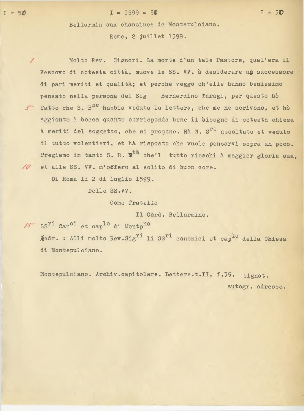 La morte d'un tale Pastore, qual' era il Vescovo di cotesta città, muove le Signorie Vostre a desiderare un successore di pari meriti et qualità; et perché veggo ch' elle hanno benissimo pensato nella persona del Signor Bernardino Tarugi, per questo ho fatto che Sua Beatitudine habbia veduta la lettera, che me ne scrivono, et ho aggiunto a bocca quanto corrisponda bene il bisogno di cotesta chiesa a meriti del soggetto, che si propone[1]. Ha Nostro Signore ascoltato et veduto il tutto volentieri, et ha risposto che vuole pensarvi sopra un poco. Pregiamo in tanto Sua Divin Maestà che' l tutto rieschi A maggior gloria sua, et alle Signorie Vostre m' offerò al solito di buon cuore.