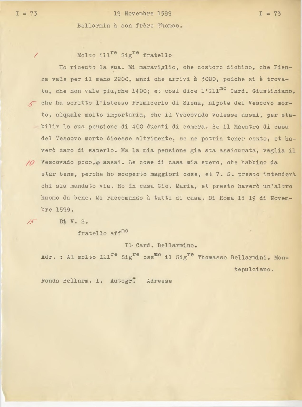 Ho ricevuto la sua. Mi meraviglio, che costoro dichino, che Pienza vale per il meno 2200, anzi che arrivi a 3000, poiché si è trovato, che non vale più,che 1400; et cosi dice l'Ill.mo Card. Giustiniano, che ha scritto l'istesso Primicerio di Siena, nipote del Vescovo morto, al quale molto importarla, che il Vescovado valesse assai, per stabilir la sua pensione di 400 ducati di camera. Se il Maestro di casa del Vescovo morto dicesse altrimenti, se ne potrà tener conto, et avrà caro di saperlo. Ma la mia pensione già sta assicurata, vaglia il Vescovado poco, o assai. Le cose di casa mia spero, che abbiano da star bene, perché ho scoperto maggiori cose, et V. S. presto intenderà chi sia mandato via. Ho in casa Gio. Maria, et presto avrò un altro uomo da bene. Mi raccomando a tutti di casa. Di Roma li 19 di Novembre 1599.