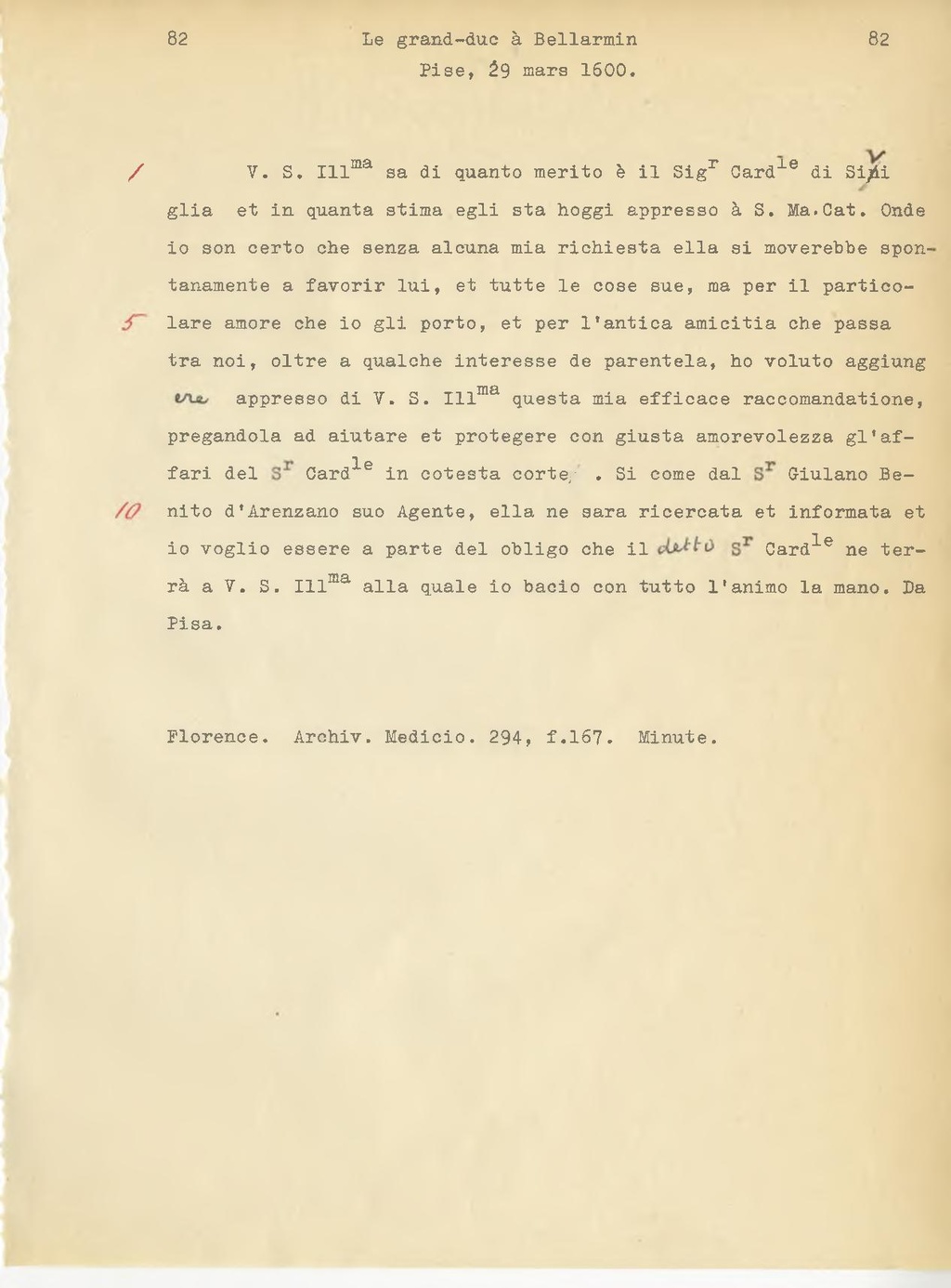 V. S. Ill.ma sa di quanto merito è il Sig.r Card.le di Senigallia et in quanta stima egli sta oggi appresso a S. Ma. Cat. Onde io son certo che senza alcuna mia richiesta ella si muoverebbe spontaneamente a favorir lui, et tutte le cose sue, ma per il particolare amore che io gli porto, et per l'antica amicizia che passa tra noi, oltre a qualche interesse di parentela, ho voluto aggiungere appresso di V. S. Ill.ma questa mia efficace raccomandazione, pregandola ad aiutare et proteggere con giusta amorevolezza gl'affari del Card.le in cotesta corte. Si come dal S.r Giuliano Benito d'Arenzano suo Agente, ella ne sarà ricercata et informata et io voglio essere a parte del obbligo che il detto S.r Card.le ne terrà a V. S. Ill.ma alla quale io bacio con tutto l'animo la mano. Da Pisa.
