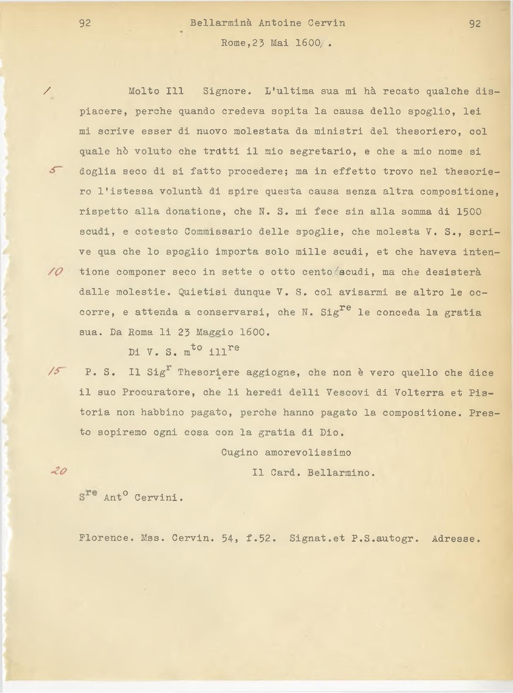 L'ultima sua mi ha recato qualche dispiacere, perché quando credeva sopita la causa dello spoglio, lei mi scrive esser di nuovo molestata da ministri del thesoriero, col quale ho voluto che tratti il mio segretario, e che a mio nome si doglia seco di si fatto procedere; ma in effetto trovo nel thesoriero l'istessa volontà di spire questa causa senza altra composizione, rispetto alla donazione, che N. S. mi fece sin alla somma di 1500 scudi, e cotesto Commissario delle spoglie, che molesta V. S., scrive qua che lo spoglio importa solo mille scudi, et che aveva intenzione componer seco in sette o otto cento scudi, ma che desisterà dalle molestie. Quietisi dunque V. S. col avvisarmi se altro le occorre, e attenda a conservarsi, che N. Sig.re le conceda la gratia sua. Da Roma li 23 Maggio 1600.