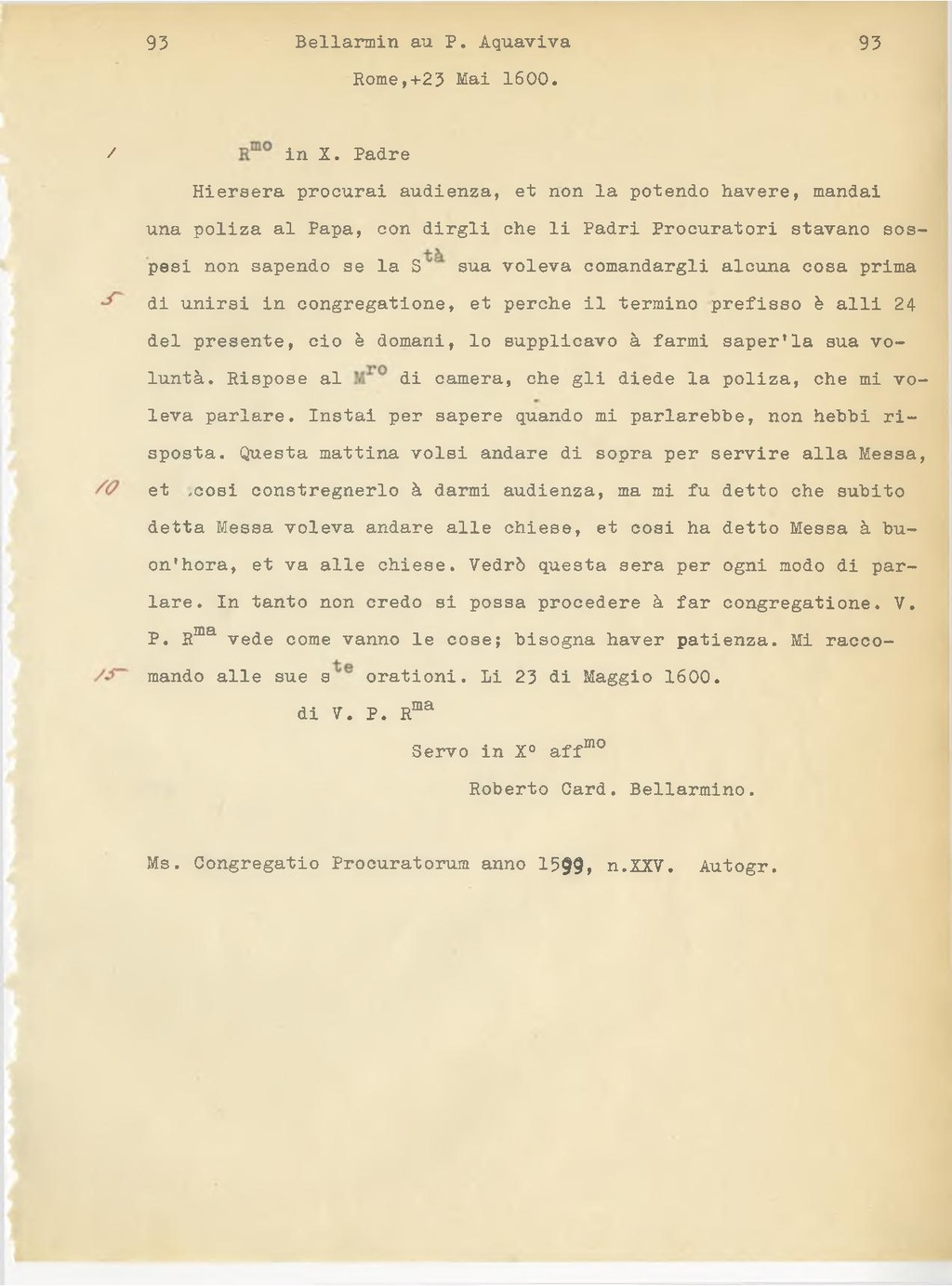 del presente, cioè domani, lo supplicavo a farmi saper'la sua volontà. Rispose al Maestro di camera, che gli diede la polizza, che mi voleva parlare. Instai per sapere quando mi parlerebbe, non ebbi risposta. Questa mattina volsi andare di sopra per servire alla Messa, et così constringerlo a darmi audienza, ma mi fu detto che subito detta Messa voleva andare alle chiese, et così ha detto Messa a buon'ora, et va alle chiese. Vedrò questa sera per ogni modo di parlare. In tanto non credo si possa procedere a far congregazione. V. P. R.ma vede come vanno le cose; bisogna aver pazienza. Mi raccomando alle sue sante orazioni. Li 23 di Maggio 1600.
