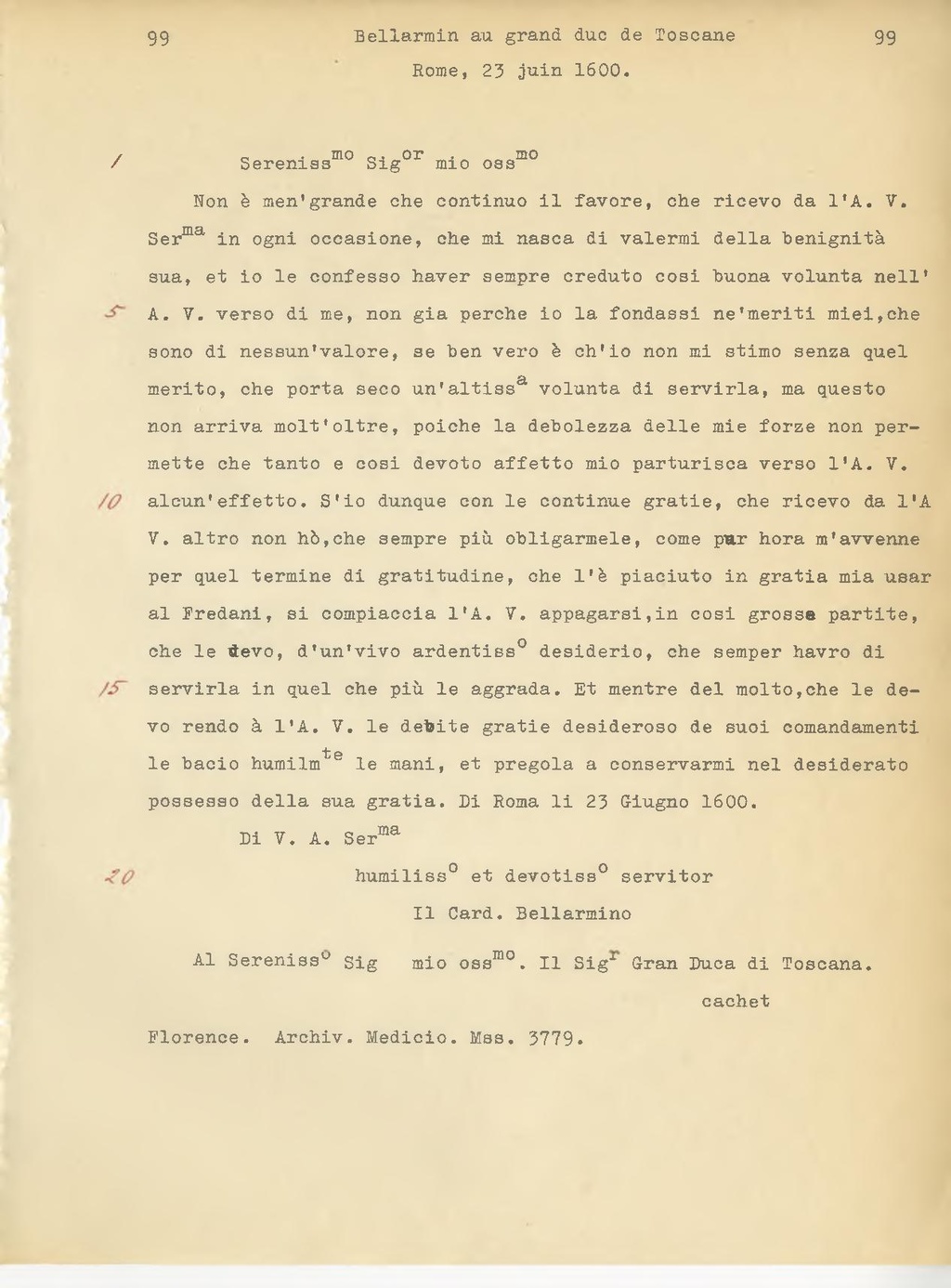 Ser.mz in ogni occasione, che mi nasca di valermi della benignità sua, et io le confesso aver sempre creduto così buona volontà nell' A. V. verso di me, non già perché io la fondassi ne'meriti miei, che sono di nessun'valore, se ben vero è ch'io non mi stimo senza quel merito, che porta seco un'altissima volontà di servirla, ma questo non arriva molt'oltre, poiché la debolezza delle mie forze non per mette che tanto e così devoto affetto mio partorisca verso l'A. V. alcun'effetto. S'io dunque con le continue grafie, che ricevo da l'A V. altro non ho,che sempre più obbligarmele, come par ora m'avvenne per quel termine di gratitudine, che l'è piaciuto in grazia mia usar al Fredani, si compiaccia l'A. V. appagarsi,in così grosse partite, che le devo, d'un'vivo ardentissimo desiderio, che sempre avrò di servirla in quel che più le aggrada. Et mentre del molto, che le devo rendo a l'A. V. le debite grazie desideroso de suoi comandamenti le bacio umilmente le mani, et pregola a conservarmi nel desiderato possesso della sua grazia. Di Roma li 23 Giugno 1600.