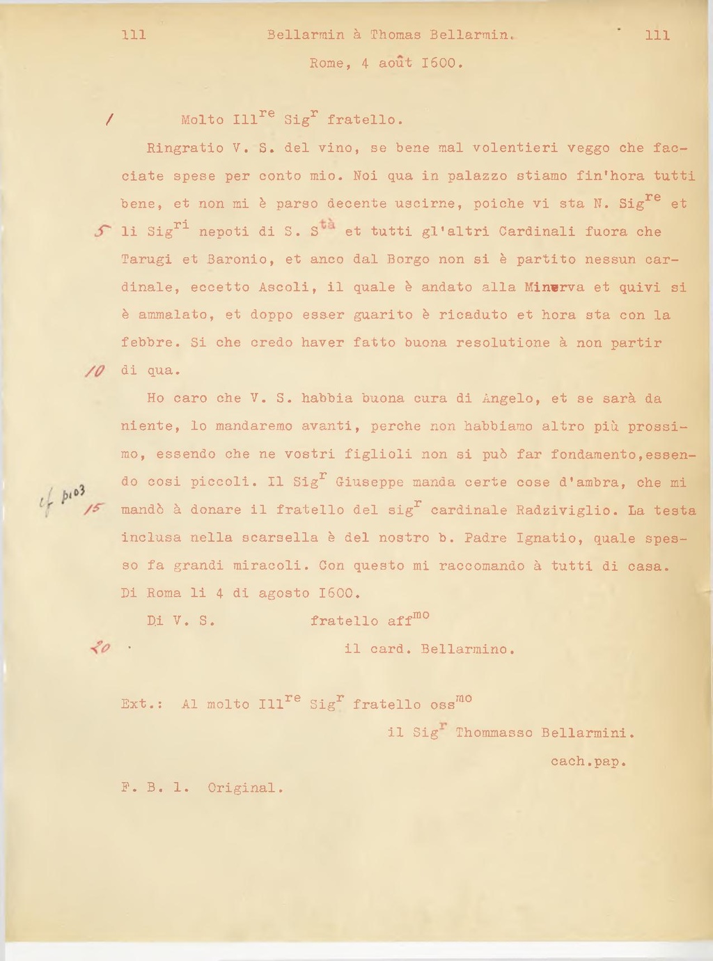 Al molto Ill.re Sig.r fratello oss.mo il Sig Thommasso Bellarmino.