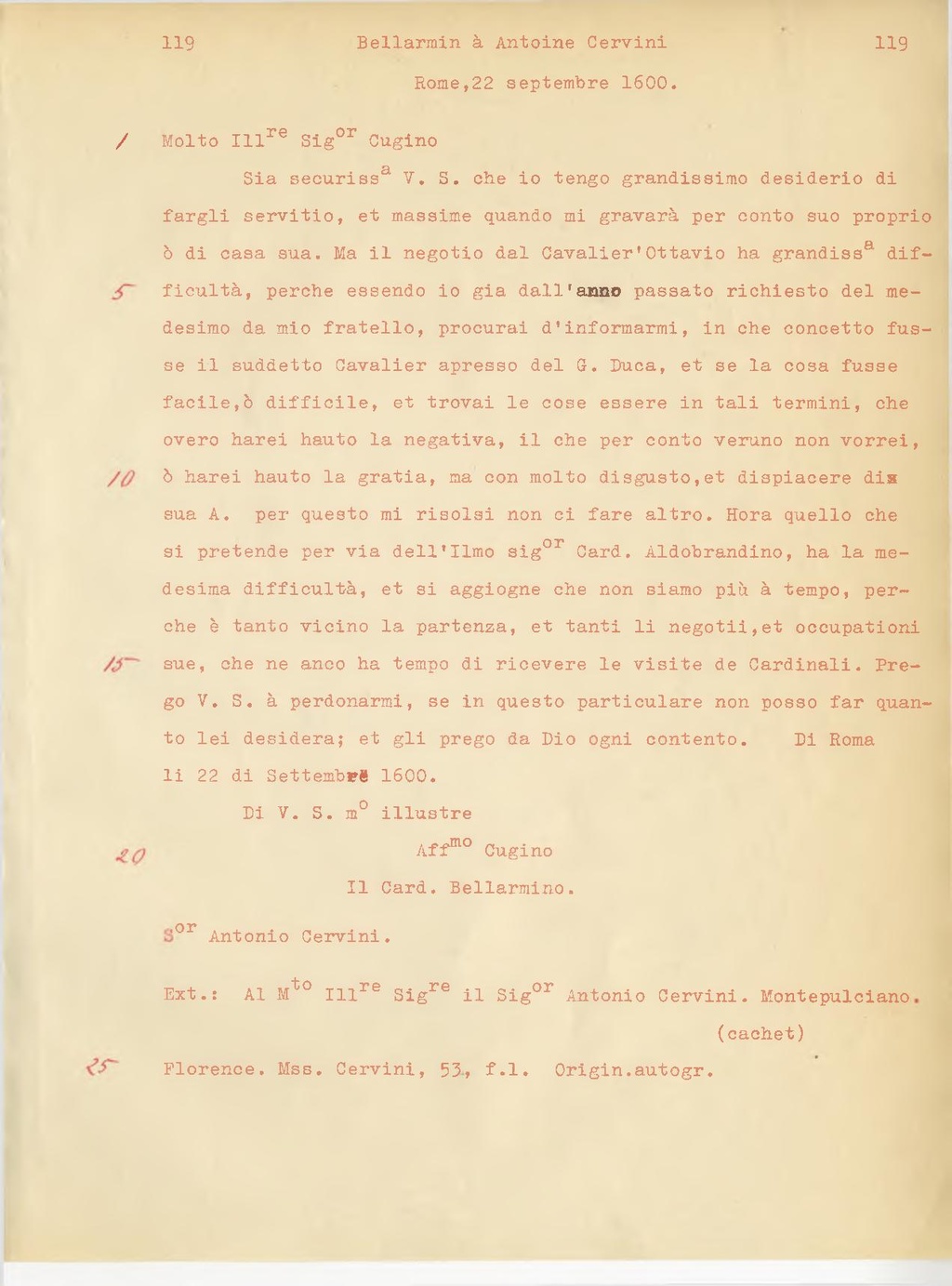 Di Roma li 22 di Settembre 1600.
